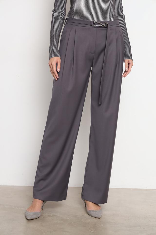 Брюки имеют широкий крой, обеспечивающий свободу движений и создающий современный силуэт. Высокая посадка и пояс с пряжкой подчеркивают талию и добавляют образу изысканности. Передняя часть брюк украшена аккуратными складками, придающими им классический вид.