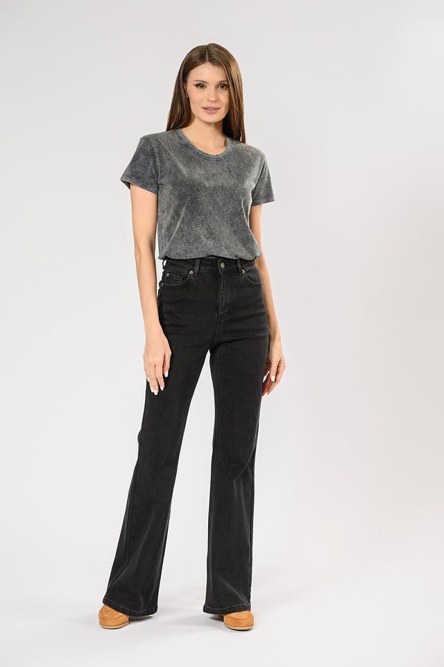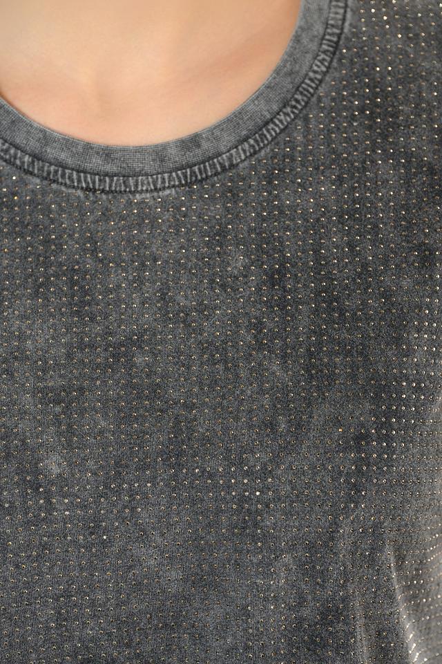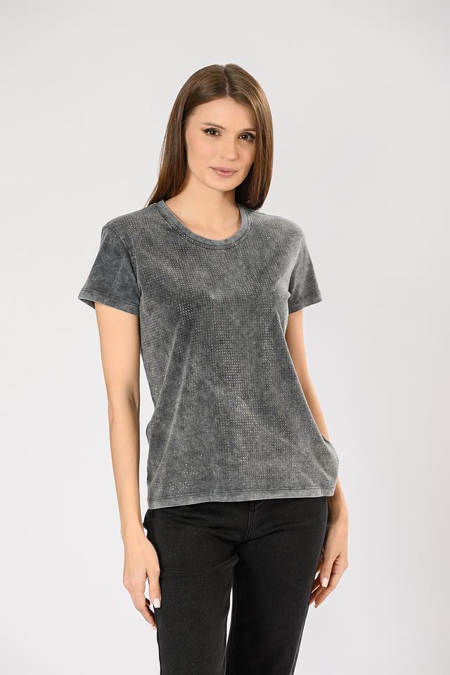 Модель имеет прямой крой и короткие рукава, что делает ее универсальной для различных стилей и образов. Серый цвет футболки дополнен деликатным мерцанием блесток, которые придают ей особый шарм и изысканность.