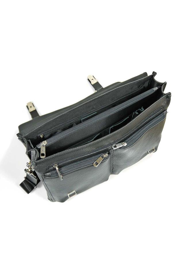 Портфель имеет удобную ручку для переноски в руке и регулируемый плечевой ремень для комфортного ношения на плече. Внутри предусмотрено несколько отделений для документов, планшета и других необходимых вещей. На передней части портфеля расположены два накладных кармана с декоративными ремнями и пряжками.