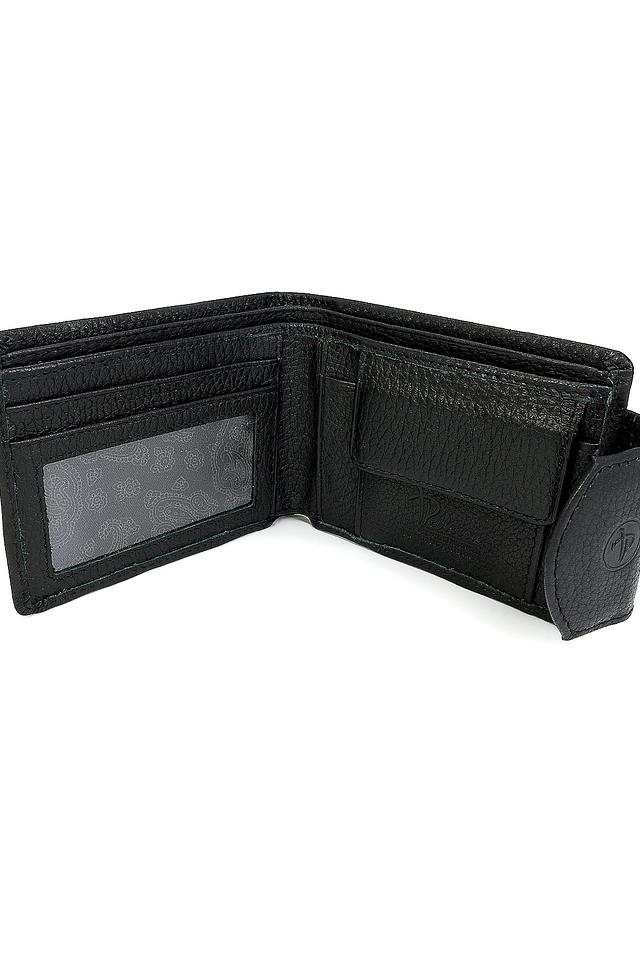 Мужской кошелек Pellecon выполнен из высококачественной натуральной кожи, что обеспечивает долговечность и приятные тактильные ощущения. Классический чёрный цвет делает его универсальным дополнением к любому образу.