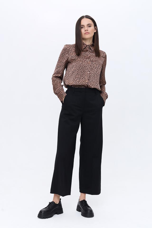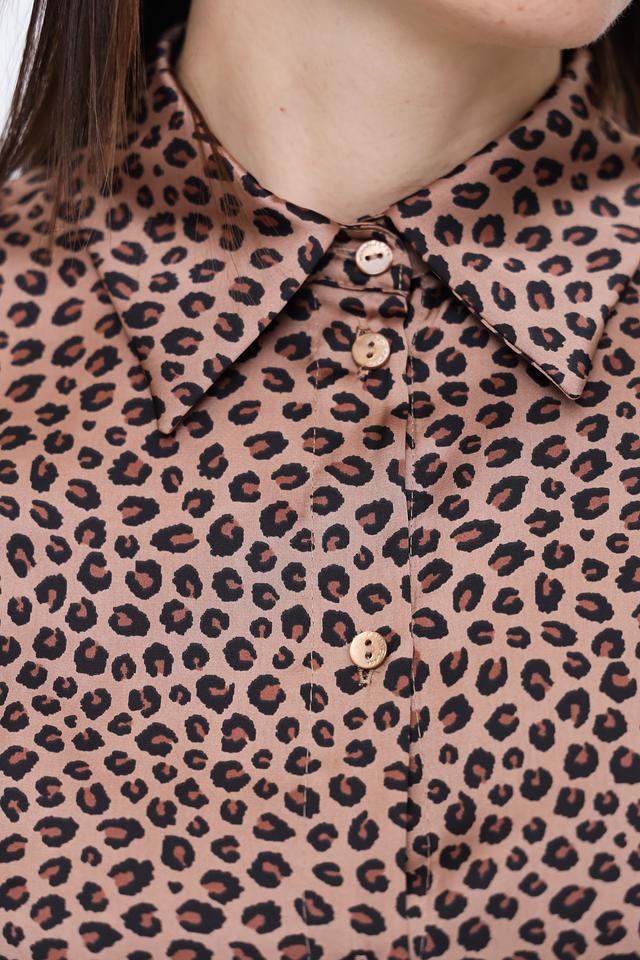 Рубашка имеет классический крой с длинными рукавами и отложным воротником. Застежка на пуговицах обеспечивает удобство ношения. Привлекательный леопардовый принт делает эту модель особенной и позволяет создавать запоминающиеся луки.