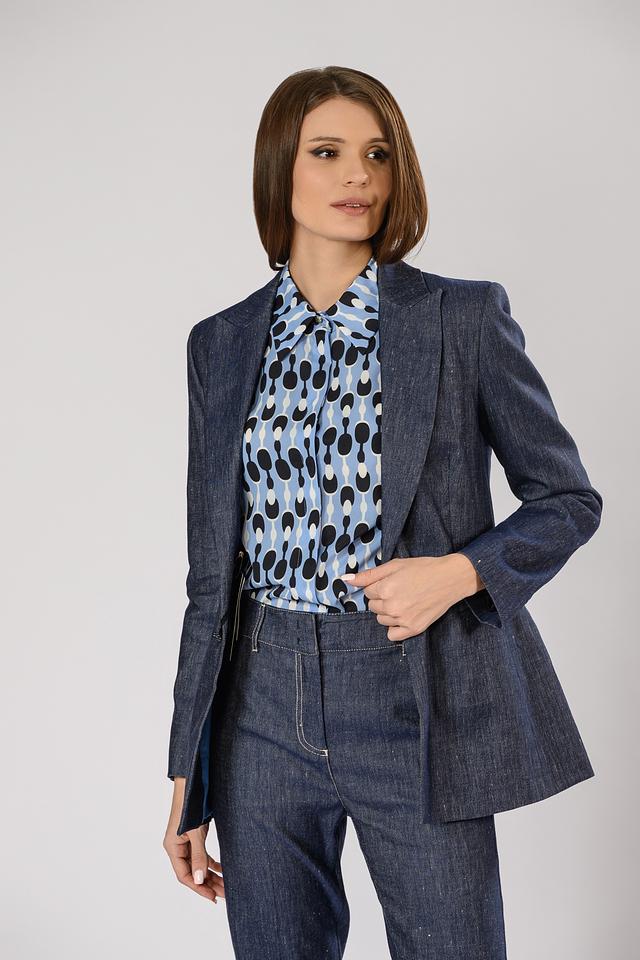 Жакет имеет прямой крой, лацканы и длинные рукава с декоративными пуговицами. Застежка – на одну пуговицу. Текстура ткани напоминает деним, что придает жакету современный и непринужденный вид.