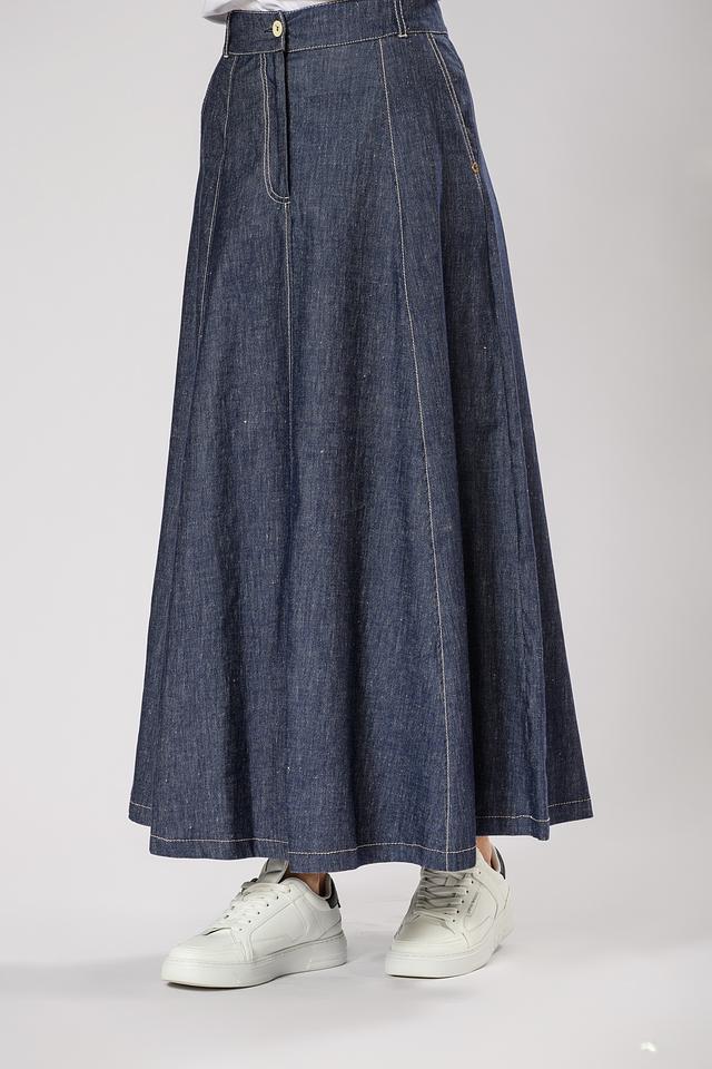 Джинсовая юбка Penny Black макси длины выполнена в классическом синем цвете. Модель имеет высокую посадку, застежку на молнию и пуговицу, а также функциональные карманы. Идеальный выбор для создания стильного и комфортного образа. Состав: лен 50%, хлопок 48%, эластан 2%