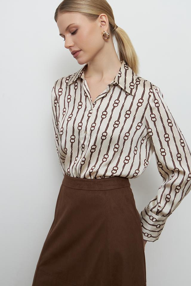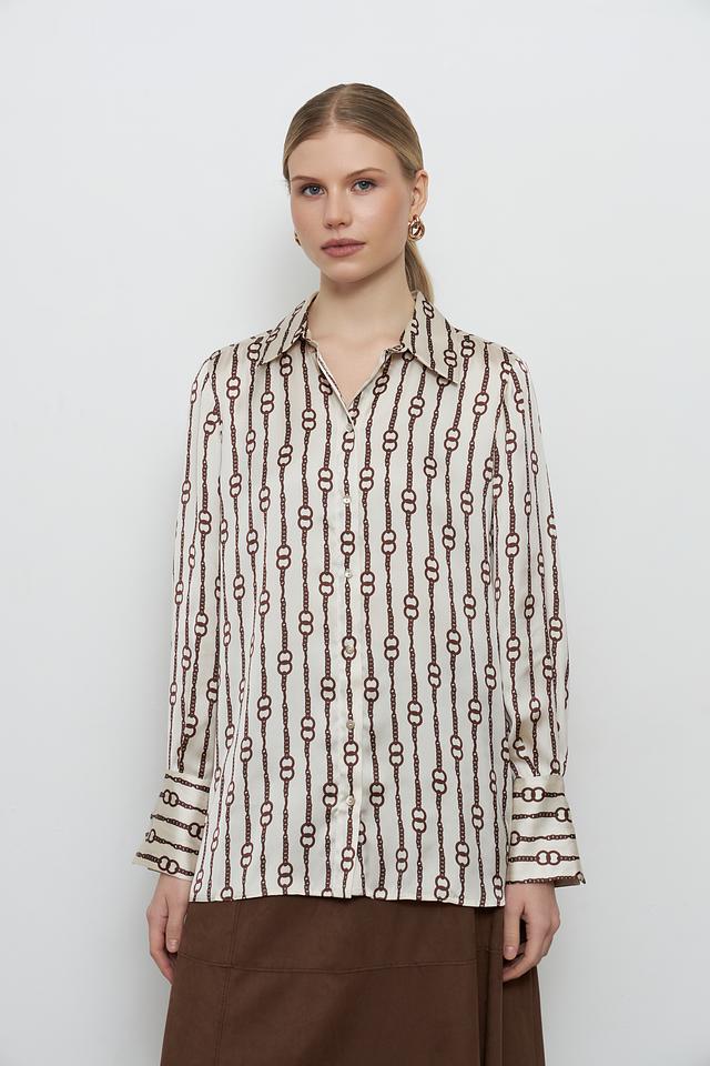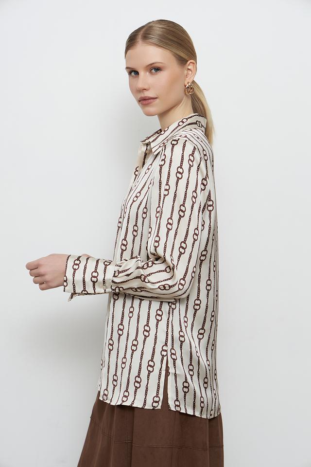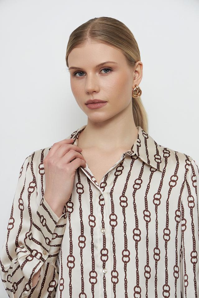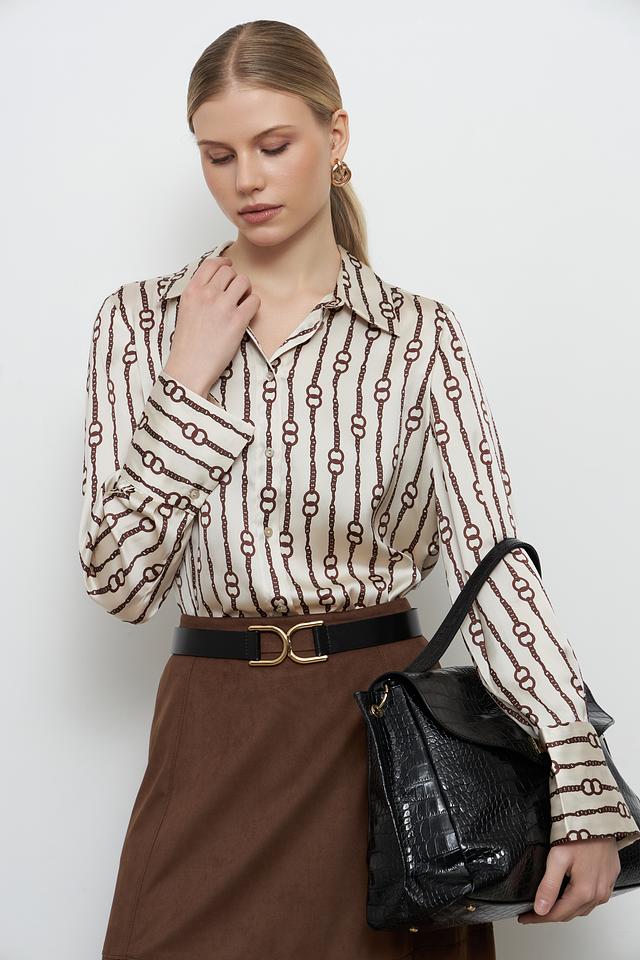 Бежевая блуза Penny Black с длинным рукавом и оригинальным принтом в виде цепочек. Изготовлена из полиэстера, что обеспечивает легкость и комфорт в носке. Идеально подойдет для создания стильного и элегантного образа. Состав: полиэстер 100%