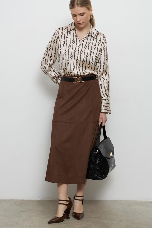 Блуза имеет классический крой с длинными рукавами и отложным воротником. Она изготовлена из 100% полиэстера, что делает ее приятной на ощупь, легкой и простой в уходе.