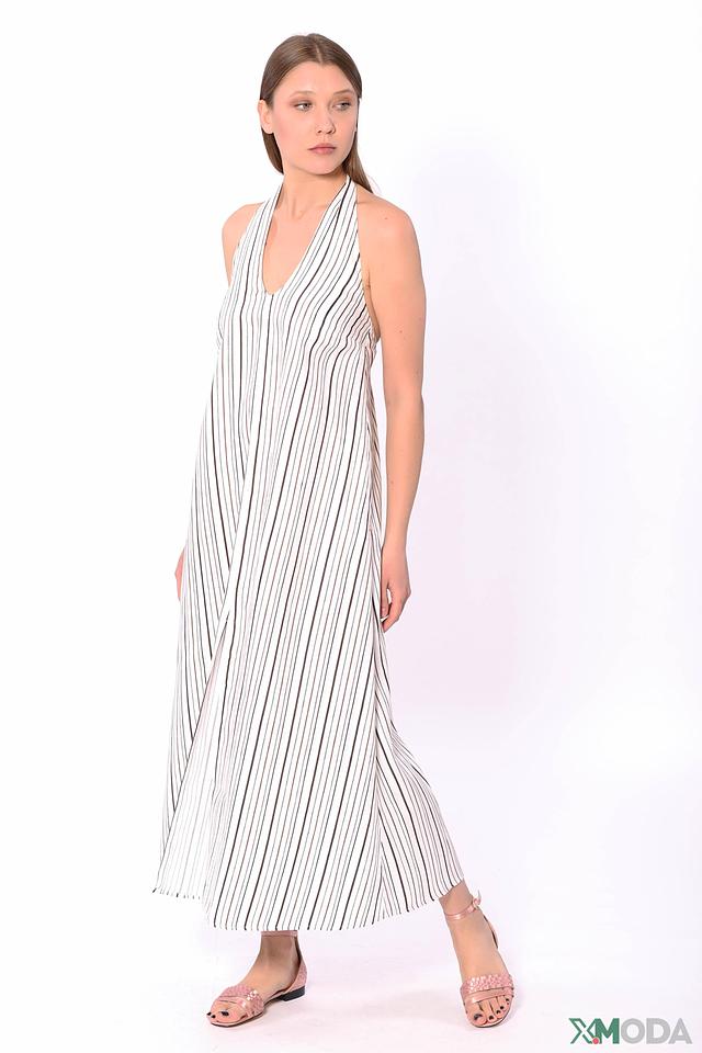 Платье имеет прямой силуэт, длину миди и открытые плечи. Завязки на плечах позволяют регулировать посадку, а пояс на талии подчеркивает достоинства фигуры. Боковые карманы добавляют практичности.