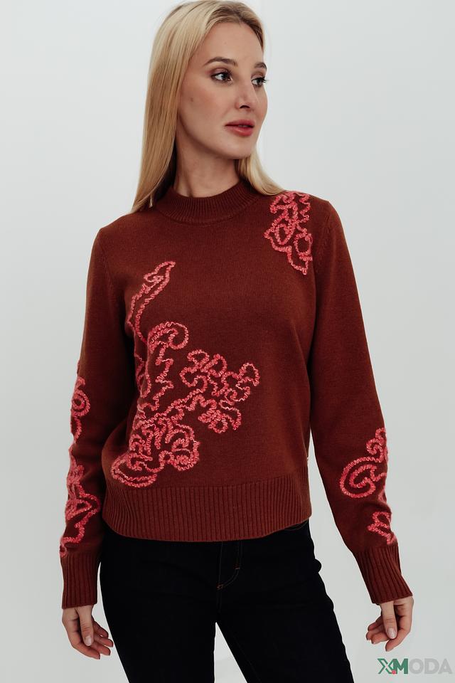 Этот джемпер от Penny Black выполнен в терракотовом цвете и украшен изысканной цветочной вышивкой. Модель имеет круглый вырез горловины и длинные рукава с манжетами.