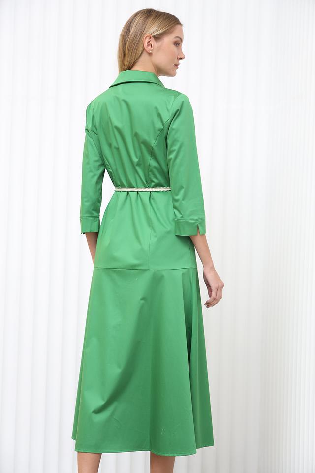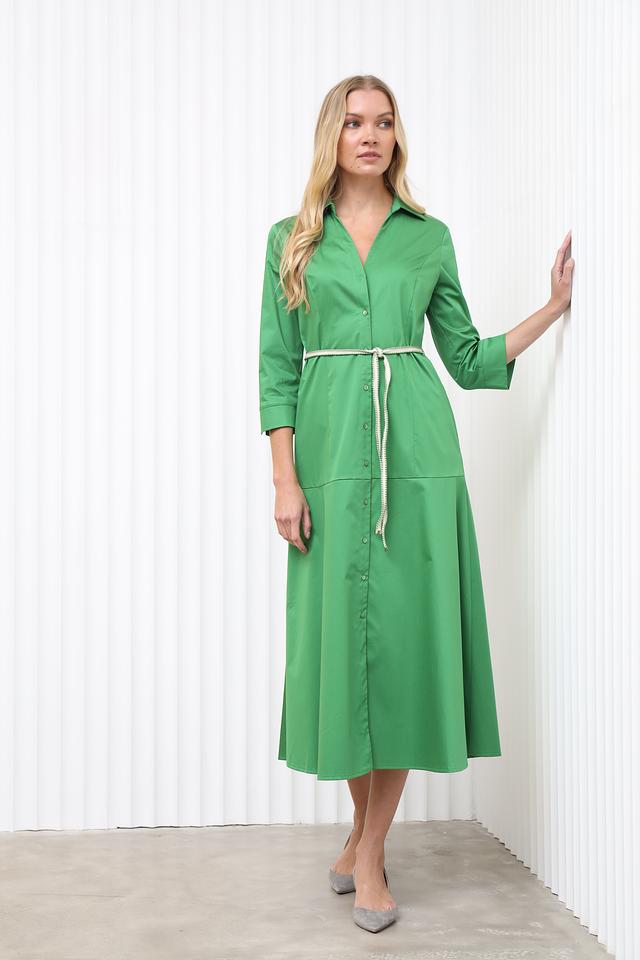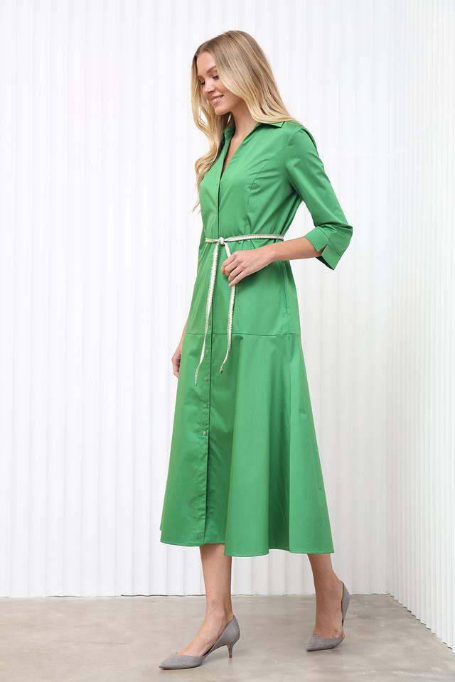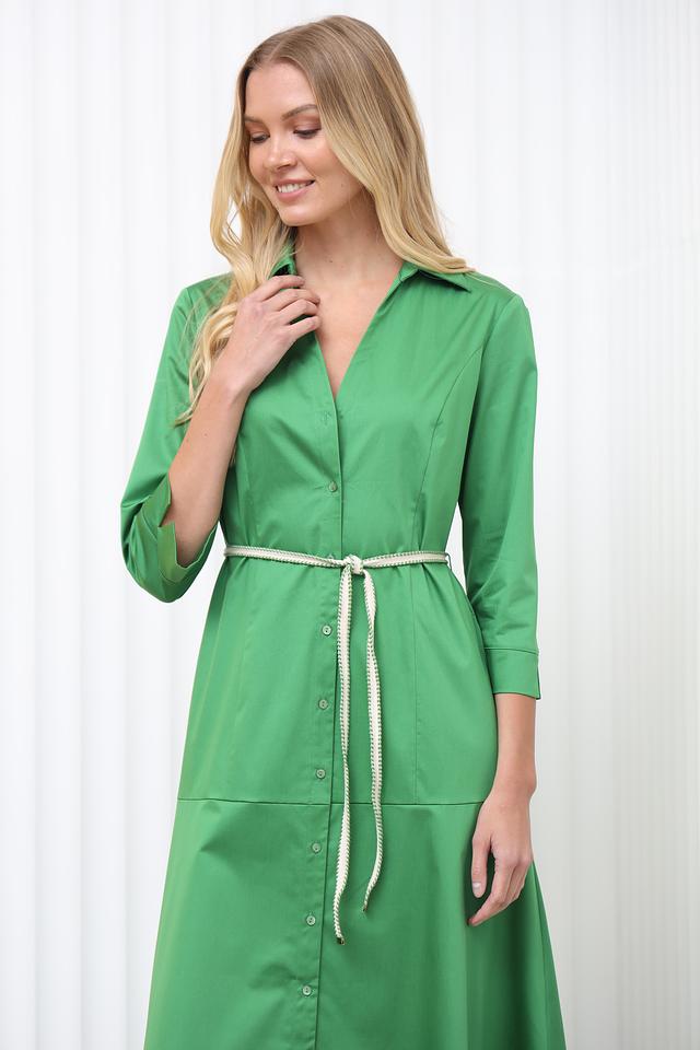 Модель имеет прямой крой, воротник рубашечного типа и застёжку на пуговицы по всей длине. Рукава длиной три четверти делают платье подходящим для тёплой погоды. Талию акцентирует съёмный пояс из ткани в тон, который можно завязать на бант или узел.