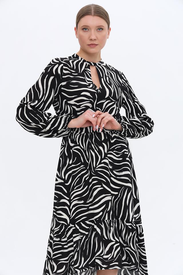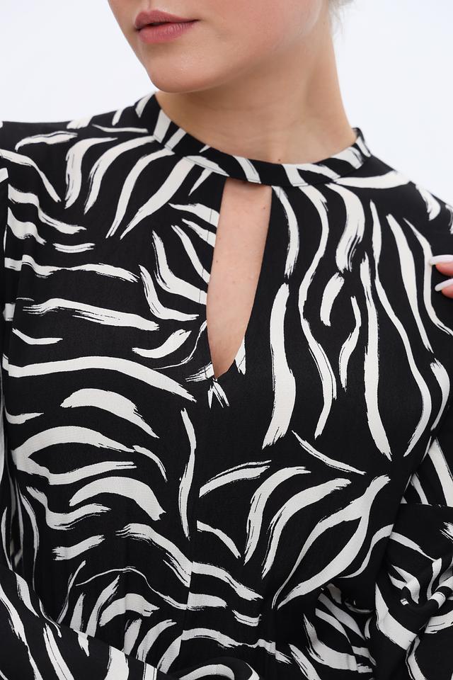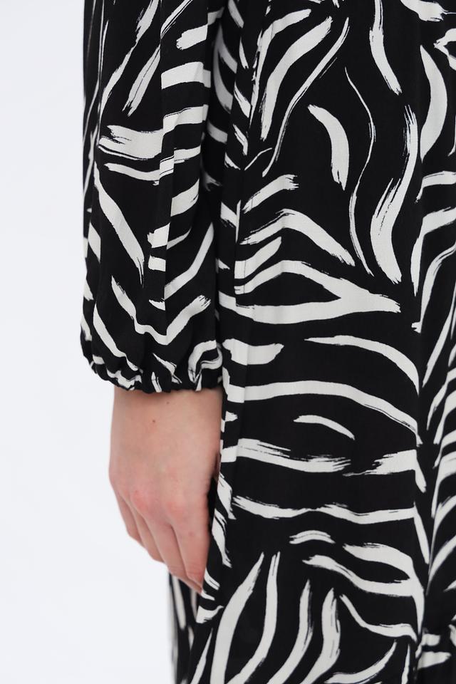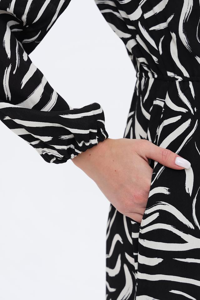 Основной цвет платья – чёрный, дополненный выразительным белым рисунком в полоску. Силуэт платья приталенный, с акцентом на талии благодаря эластичной вставке. Длинные рукава и вырез горловины с небольшим разрезом добавляют изысканности.