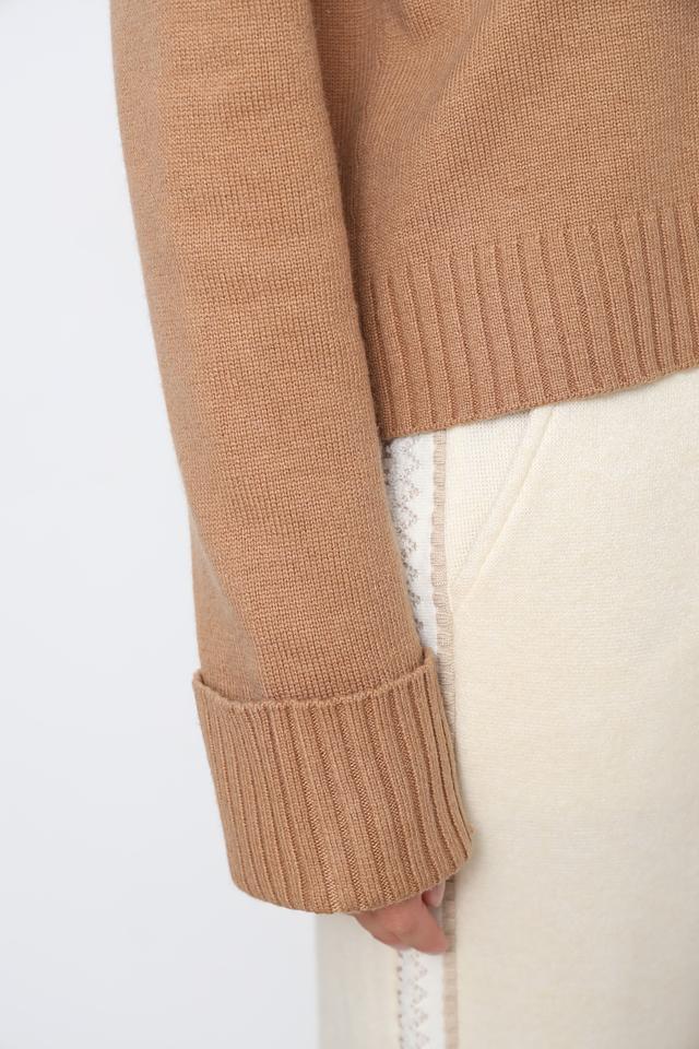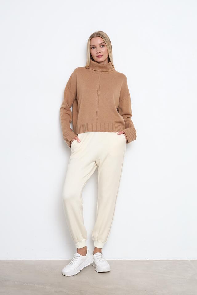 Джемпер имеет слегка свободный крой, что обеспечивает комфортную посадку по фигуре. Декоративная вставка с текстурным плетением добавляет изделию изысканности и оригинальности. Рукава джемпера имеют манжеты, обеспечивающие плотное прилегание к запястью.