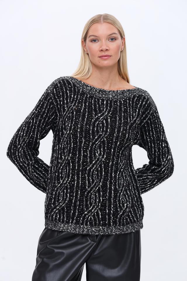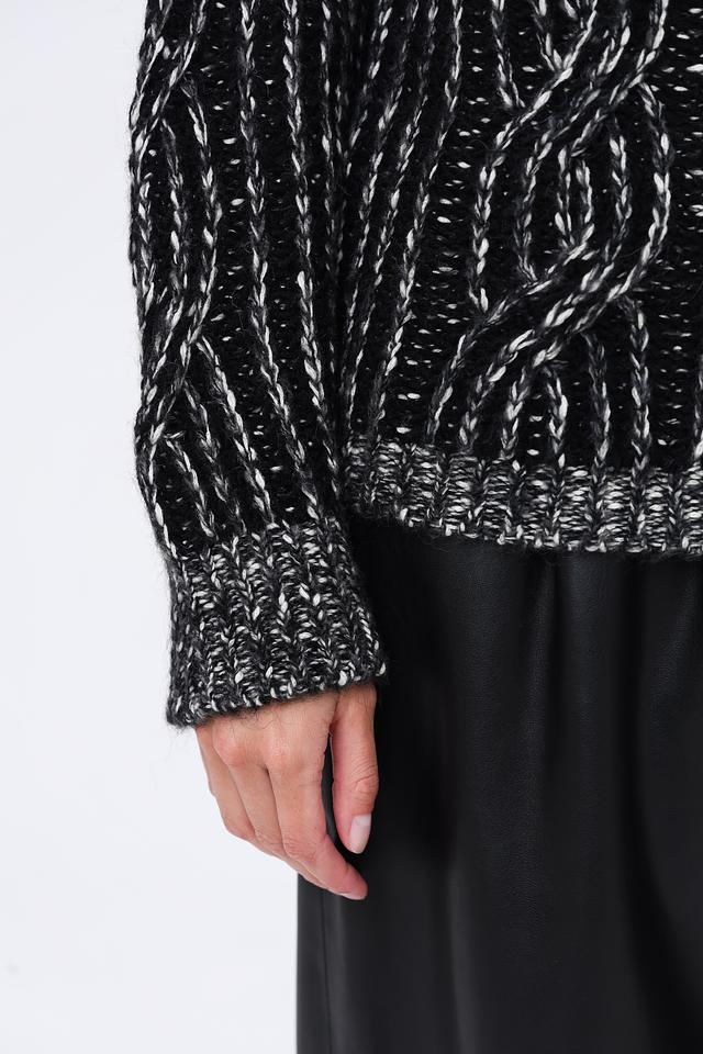 Чёрный джемпер Penny Black с выразительным узором из кос станет стильным дополнением к вашему гардеробу. Модель выполнена из мягкой пряжи с добавлением шерсти и альпаки, что обеспечивает комфорт и тепло. Состав: акрил 32%, хлопок 31%, шерсть 22%, нейлон 8%, альпака 7%