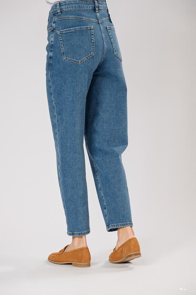 Брюки имеют прямой крой и высокую посадку в стиле mom fit, что делает их универсальными и подходящими для различных типов фигуры. Классический голубой цвет легко сочетается с другими элементами одежды, позволяя создавать разнообразные образы.