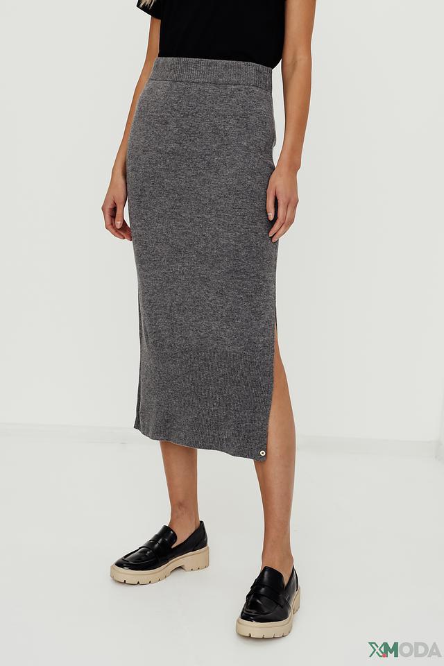 Юбка имеет классический серый цвет и выполнены в виде вязаного полотна. Модель отличается приталенным силуэтом и длиной миди, что делает ее универсальной для различных случаев. Небольшой разрез сзади добавляет образу легкости и динамики.