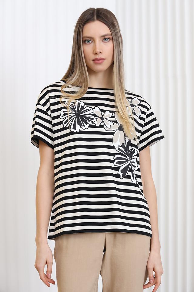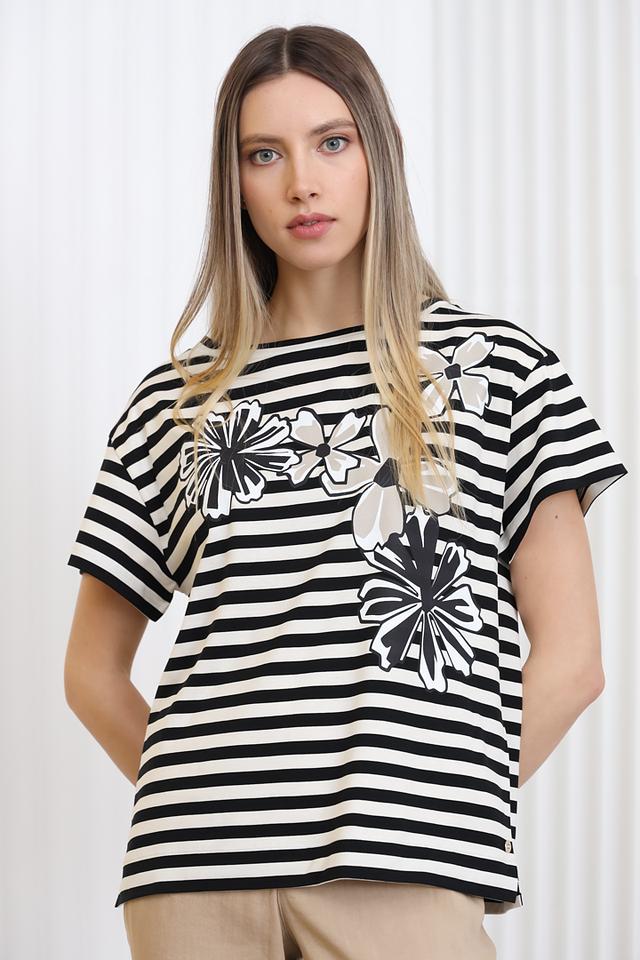 Особый акцент в этой футболке – яркий цветочный принт, расположенный на передней части изделия. Принт выполнен в контрастных чёрно-белых тонах, что делает его заметным и привлекательным.