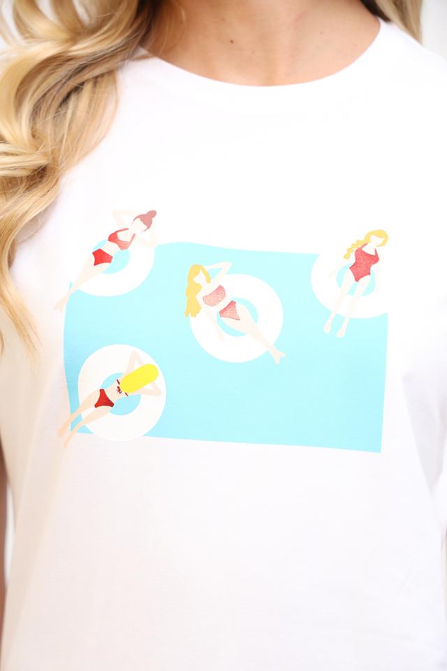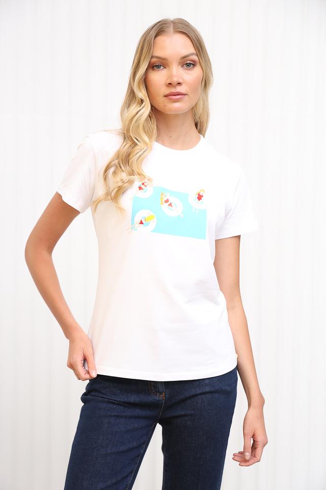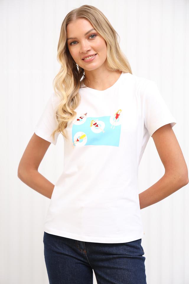 Эта стильная футболка от Penny Black выполнена в белом цвете и украшена оригинальным принтом с изображением девушек на пляже. Футболка имеет прямой крой, короткие рукава и круглый вырез горловины.