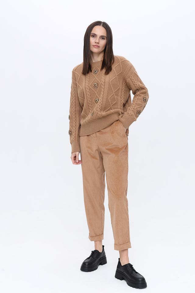 Особенностью данного джемпера является рельефный узор в виде кос, который добавляет текстуры и визуального интереса. Округлый вырез горловины и длинные рукава делают его универсальным для различных стилей. Этот джемпер идеально сочетается с брюками, юбками и джинсами, позволяя создавать разнообразные образы.