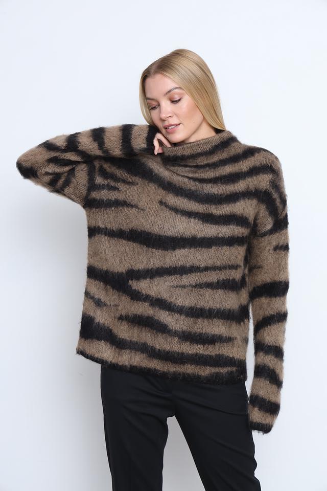 Джемпер имеет свободный крой и высокий горловину, что делает его идеальным для прохладной погоды. Коричневая основа с черными полосами создает эффектный и современный образ. Текстура пряжи с мохером придает джемперу объем и мягкость.