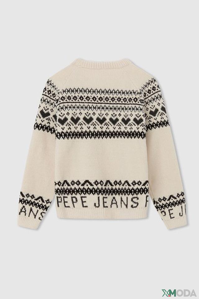 Дизайн джемпера выполнен в бежевом цвете с выразительным жаккардовым узором, включающим геометрические мотивы и логотип бренда Pepe Jeans London. Такой узор делает модель яркой и запоминающейся.
