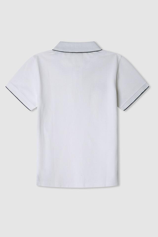 Поло имеет прямой крой, который обеспечивает свободу движений, а короткие рукава с тёмно-синей окантовкой добавляют контраста. Воротник-поло также имеет тёмно-синюю полоску по краю. Застёжка на пуговицы обеспечивает удобство одевания и снятия.