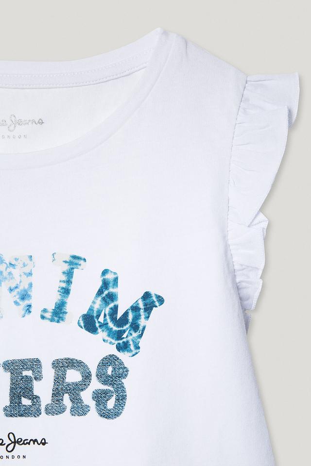 Белая футболка Pepe Jeans London для девочки с оригинальным принтом "Denim Lovers". Модель выполнена из 100% хлопка, имеет короткие рукава с оборками и удобный крой. Состав: хлопок 100%
