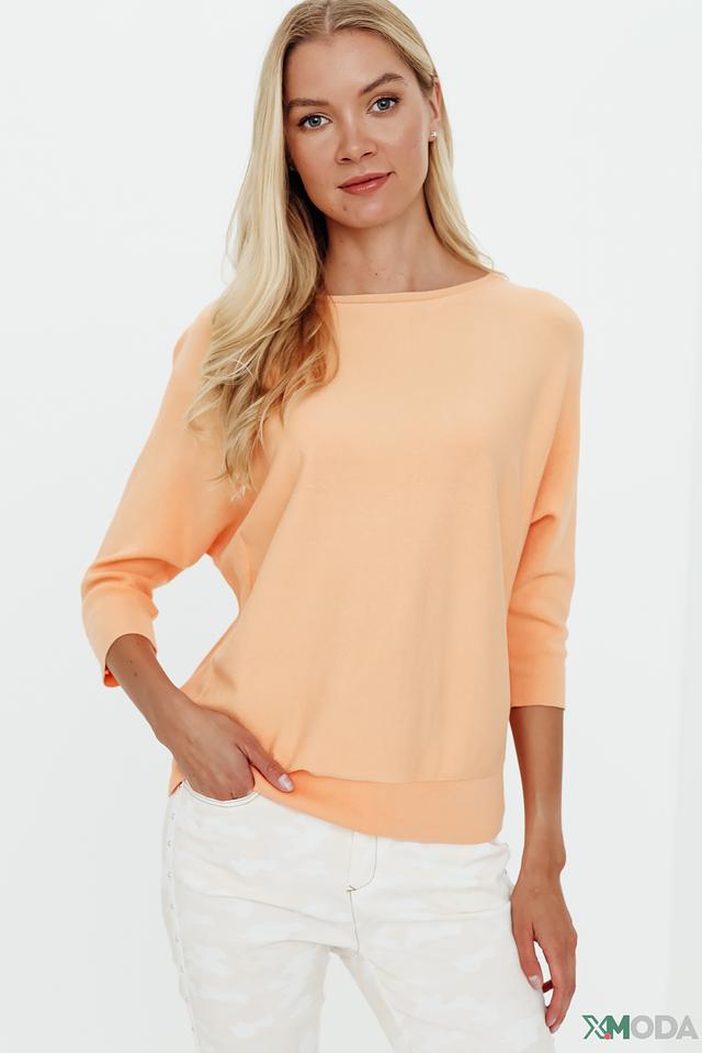 Пуловер имеет рукав три четверти и округлый вырез горловины. Текстура ткани мягкая и приятная на ощупь, благодаря сочетанию вискозы и полиамида в составе. Вискоза обеспечивает хорошую воздухопроницаемость, а полиамид – износостойкость и сохранение формы.