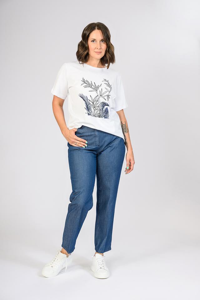 Особенностью данной модели является стильный цветочный принт в синих тонах, который добавляет образу оригинальности и свежести. Футболка имеет прямой крой и короткие рукава, что делает ее идеальным выбором для теплой погоды.