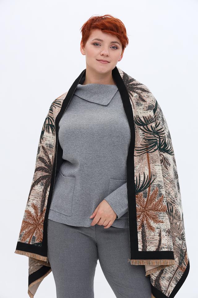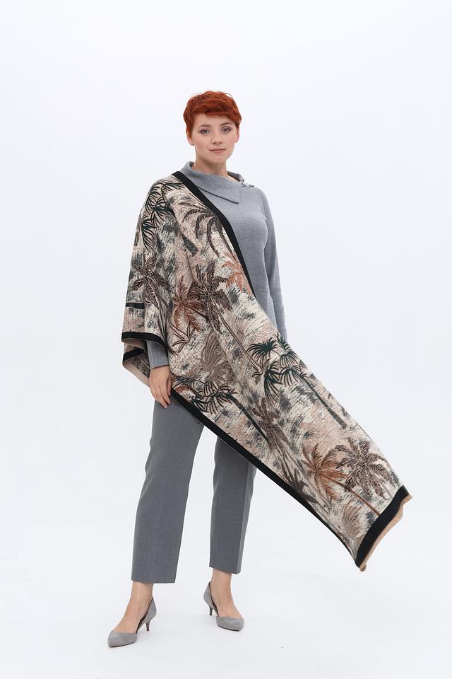 Этот шарф от бренда Pezzo – идеальный аксессуар для создания яркого и запоминающегося образа. Шарф выполнен в бежевых тонах и украшен эффектным тропическим принтом с изображением пальмовых листьев.