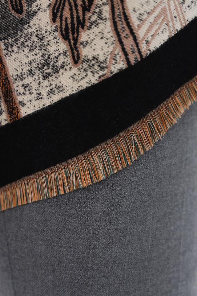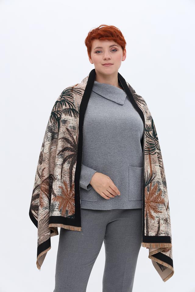 Шарф имеет прямоугольную форму и достаточно большой размер, что позволяет носить его различными способами: как платок на шее, как палантин на плечах или даже как накидку. Отделка по периметру выполнена в виде бахромы, что придает изделию дополнительный шарм.