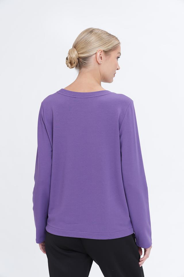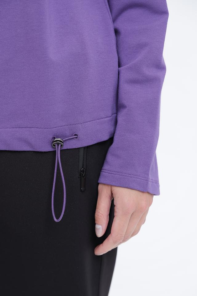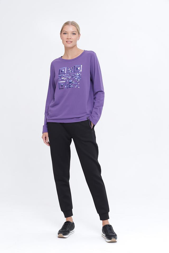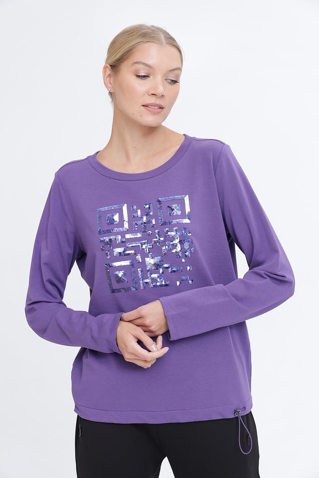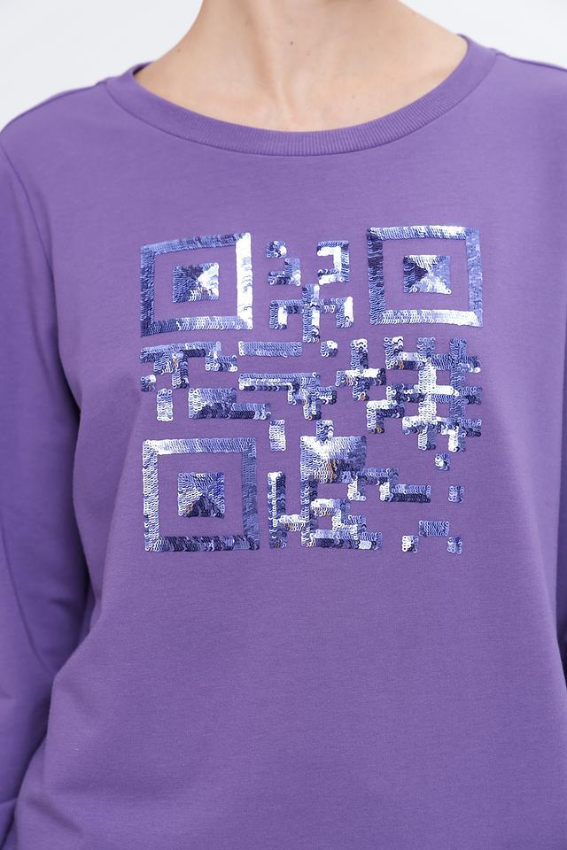 Женский пуловер Pezzo фиолетового цвета с оригинальным принтом на лицевой стороне. Изготовлен из мягкого и приятного к телу сочетания хлопка, модала и эластана, обеспечивающего комфорт при носке. Состав: хлопок 47%, модал 47%, эластан 6%