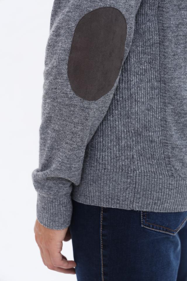Джемпер имеет длинные рукава и прямую посадку. На локтях расположены декоративные накладки из ткани, отличающейся по текстуре, что добавляет изделию оригинальности.