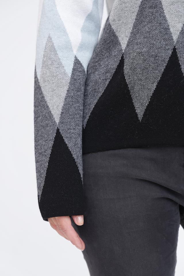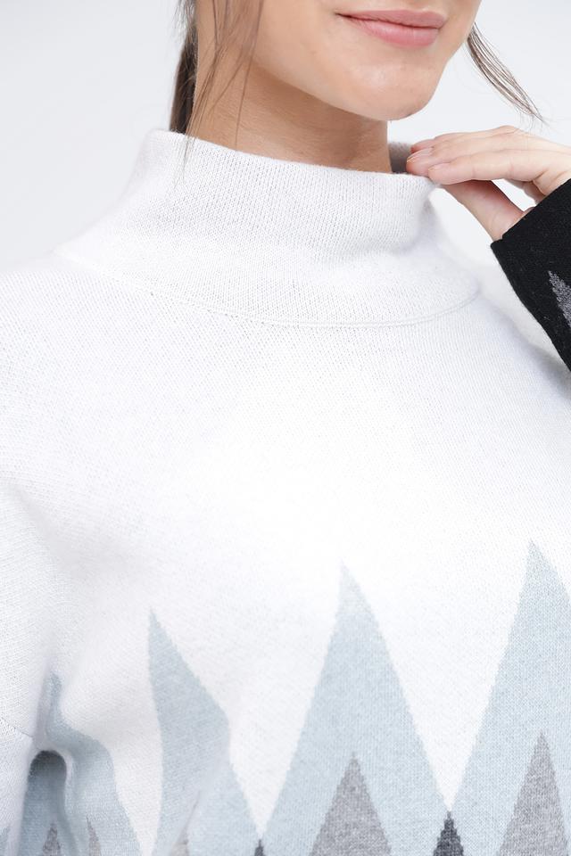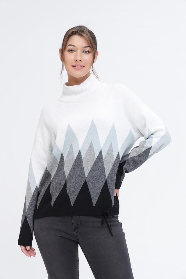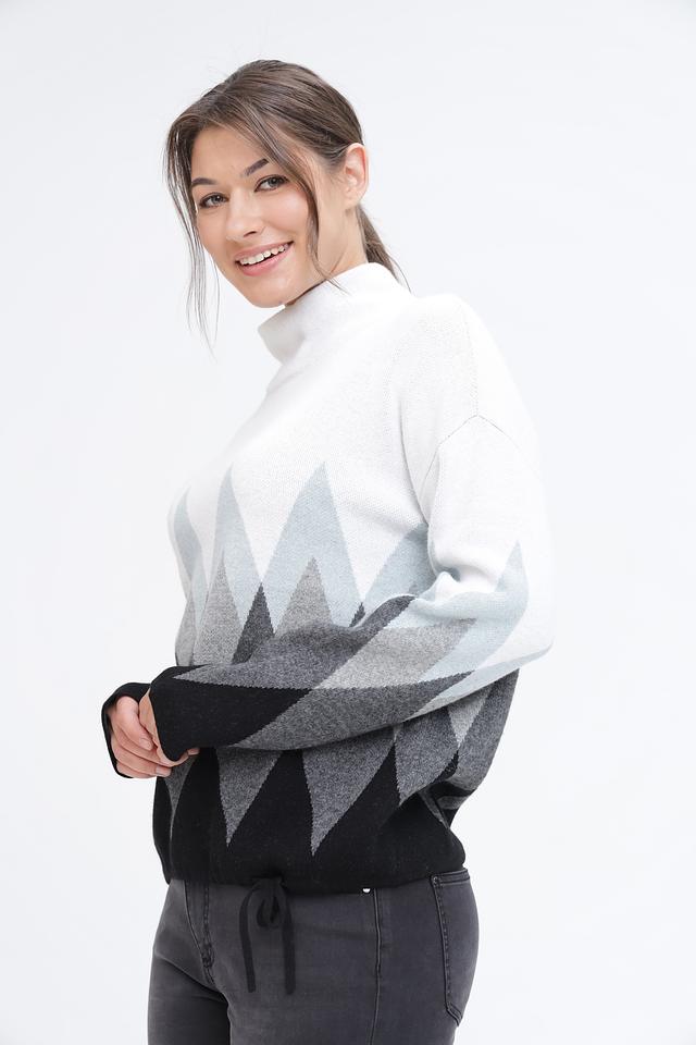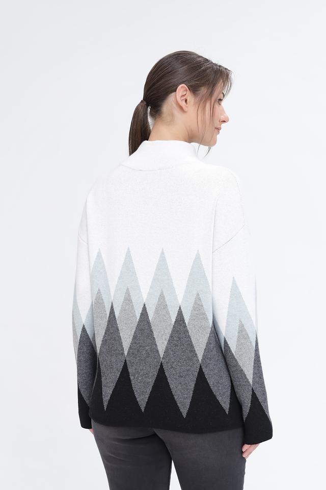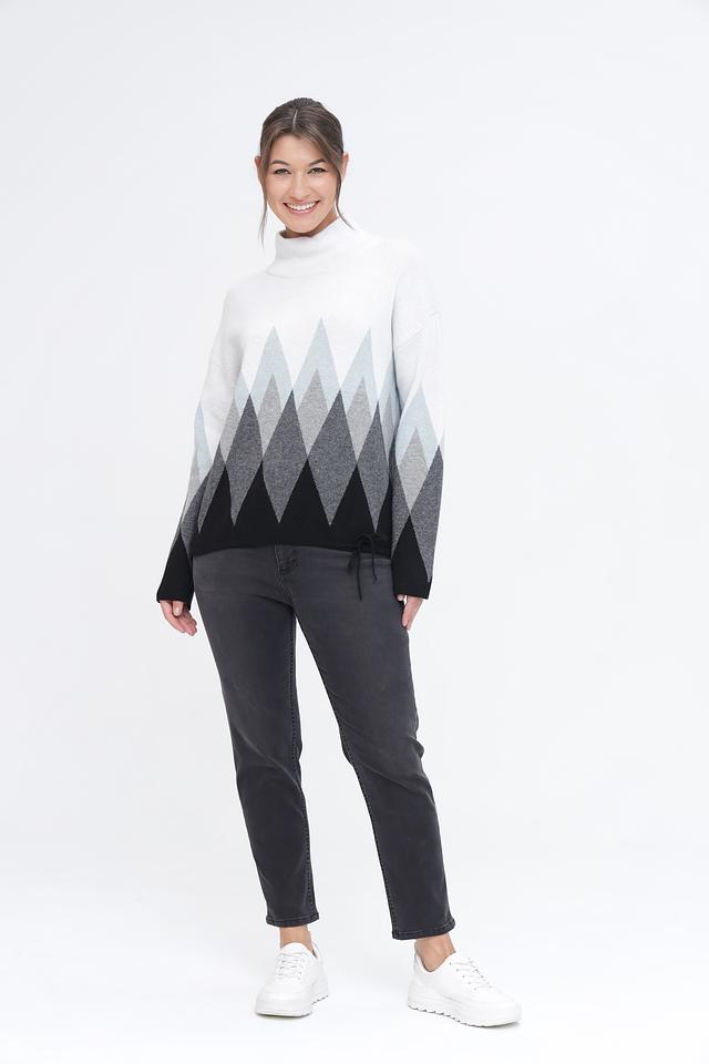 Этот пуловер от Pezzo – идеальный выбор для создания уютного и стильного образа. Модель выполнена в белом цвете и украшена выразительным геометрическим узором из ромбов, выполненным в оттенках серого и чёрного.