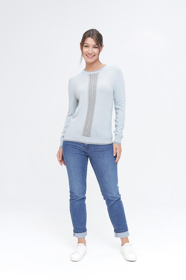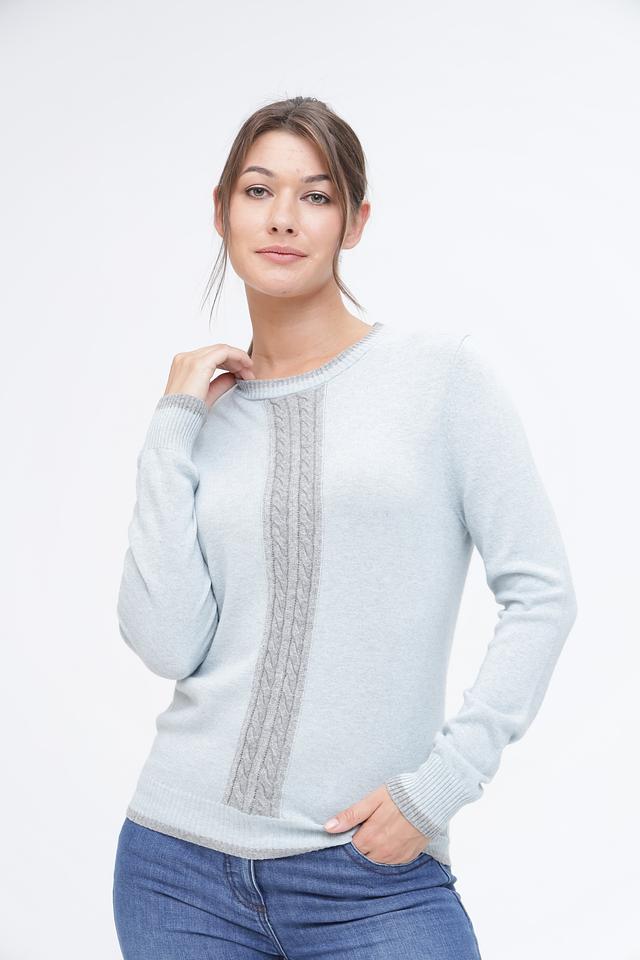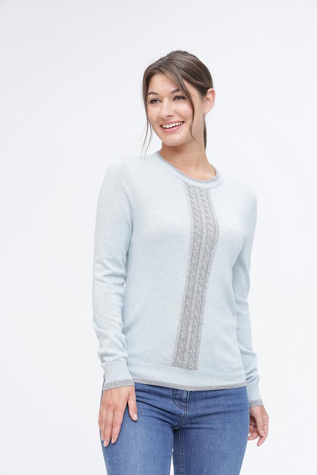 Особенностью данного пуловера является вертикальная полоса, выполненная в технике "косы", которая добавляет изделию текстуру и оригинальность. Вязаная структура пуловера обеспечивает комфорт и тепло в прохладную погоду.