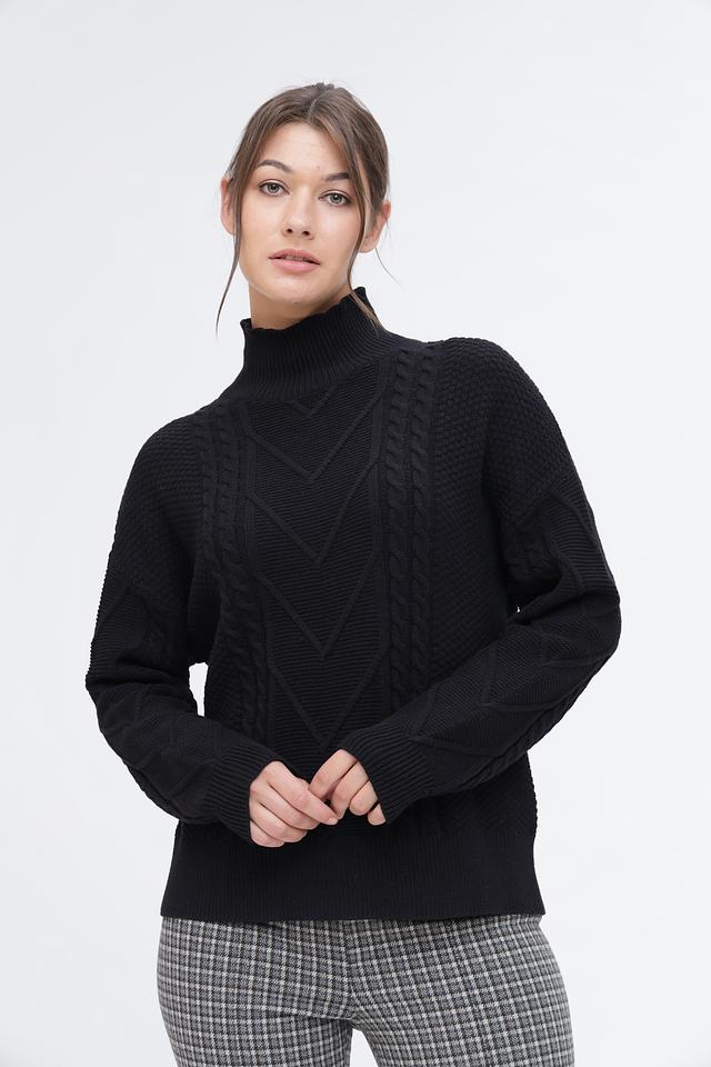 Чёрный пуловер Pezzo с высоким горлом и выразительным узором из кос. Изготовлен из мягкого и приятного к телу сочетания хлопка и акрила, обеспечивающего комфорт и тепло. Идеальный выбор для создания стильного и уютного образа. Состав: хлопок 60%, акрил 40%
