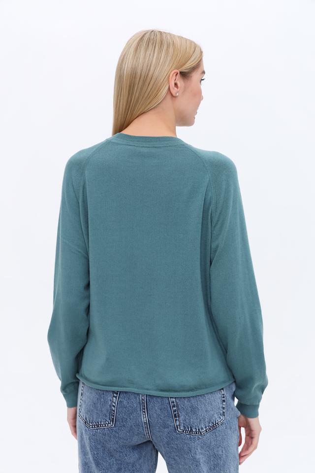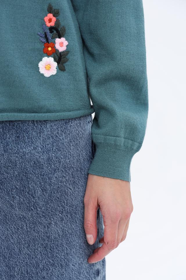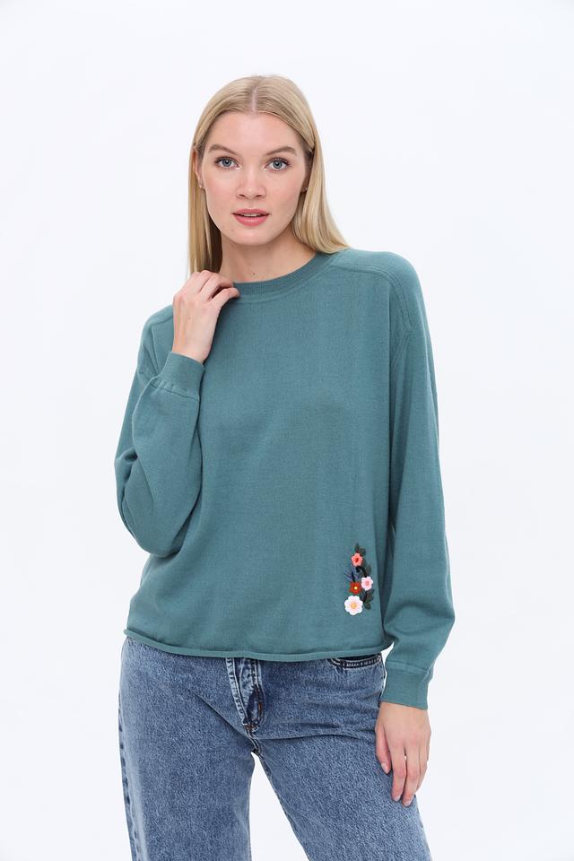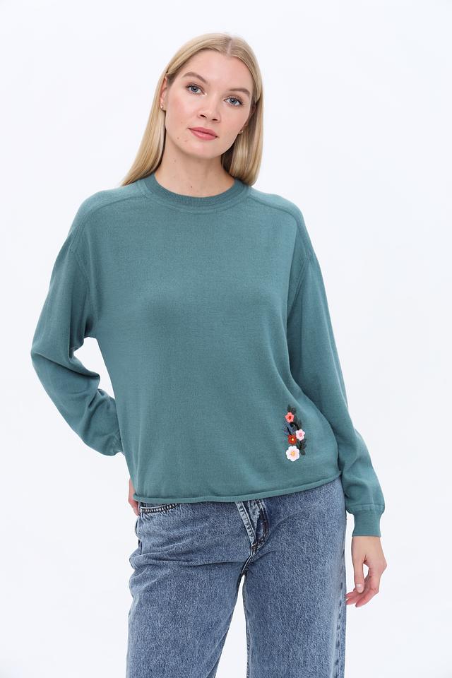 Этот пуловер от Pezzo станет отличным дополнением к вашему гардеробу. Он выполнен в спокойном зелёном цвете и украшен деликатной вышивкой в виде небольших цветов на плече.