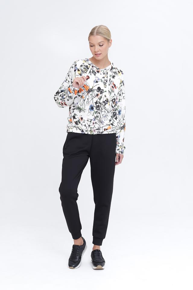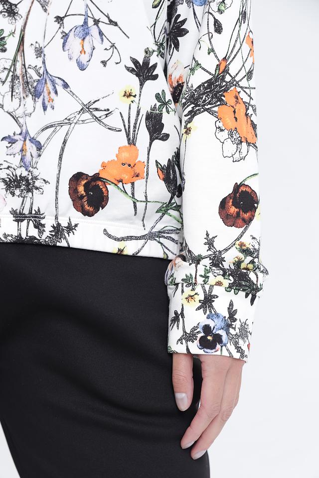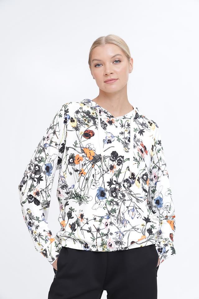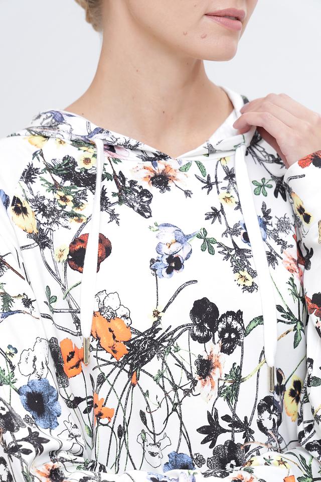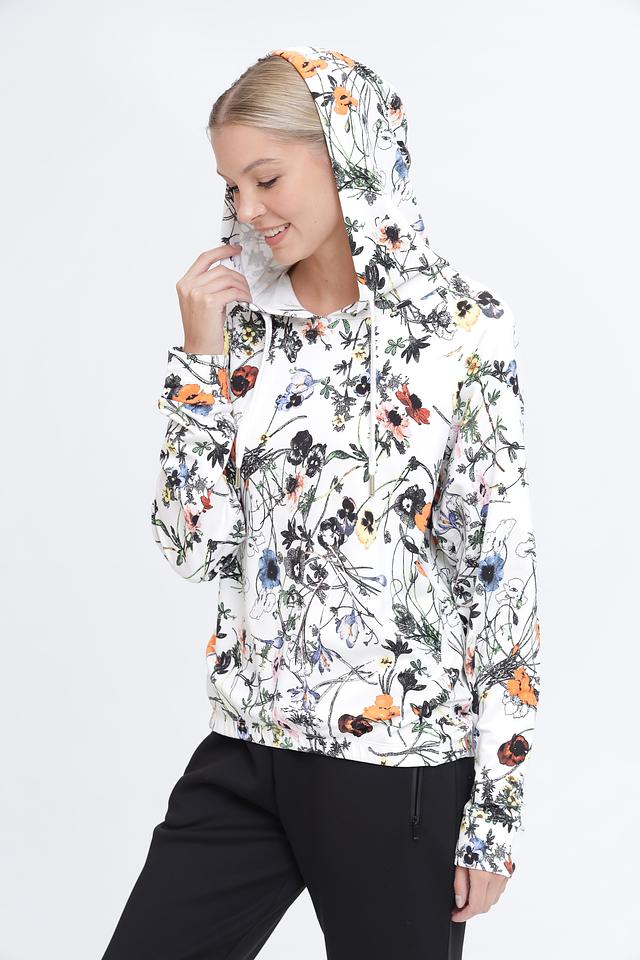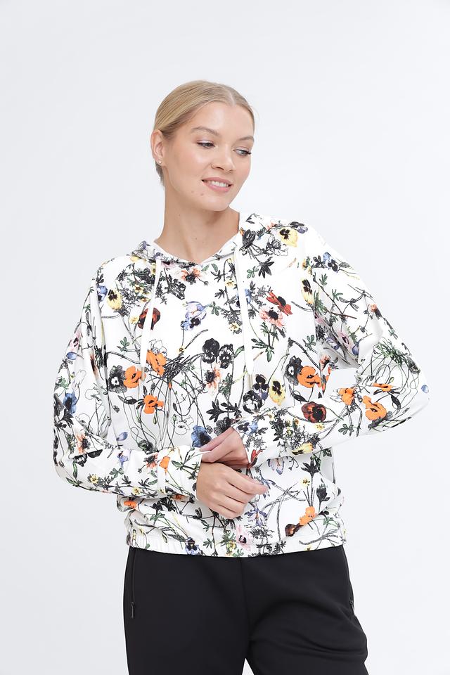 Женский пуловер Pezzo белого цвета с ярким цветочным принтом – стильное и комфортное решение для повседневного образа. Модель с капюшоном и длинными рукавами выполнена из мягкого и приятного к телу сочетания хлопка, модала и эластана. Состав: хлопок 50%, модал 45%, эластан 5%
