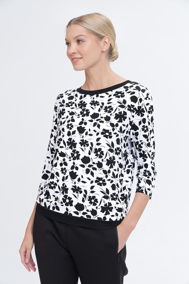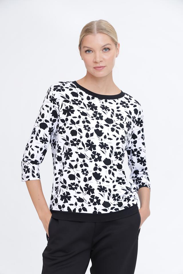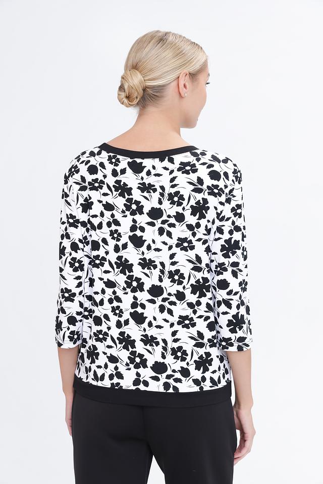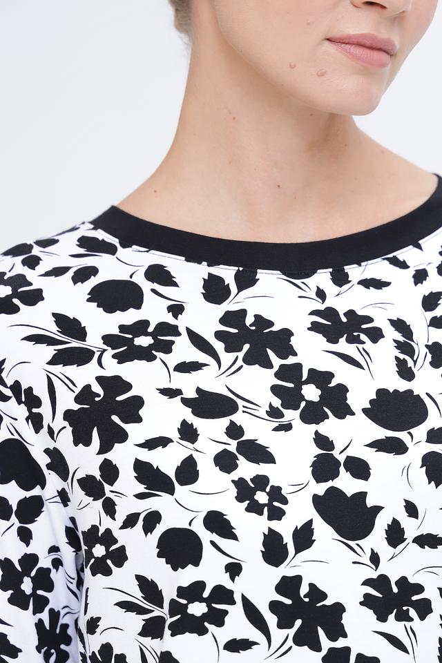 Основной цвет лонгслива – белый, а главным акцентом является яркий чёрный цветочный принт, который добавляет образу женственности и легкости. Круглый вырез горловины и рукава 3/4 делают этот лонгслив универсальным для создания различных образов.