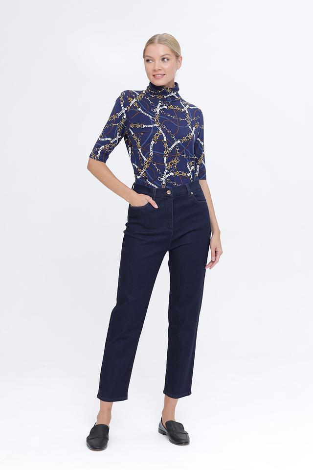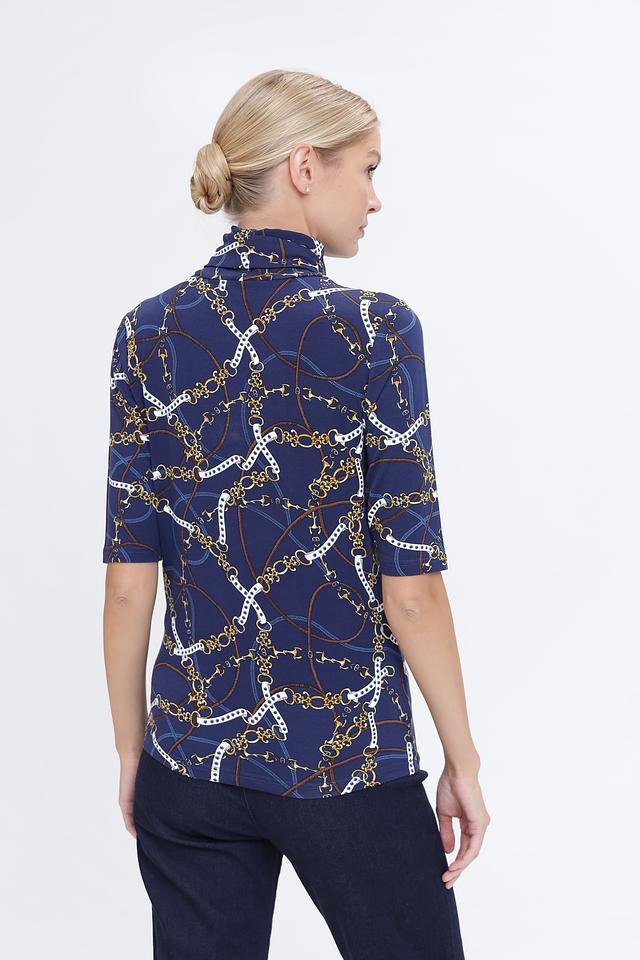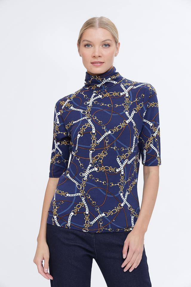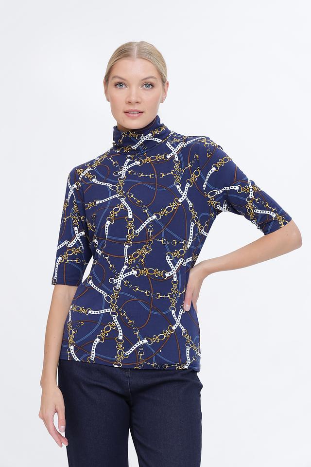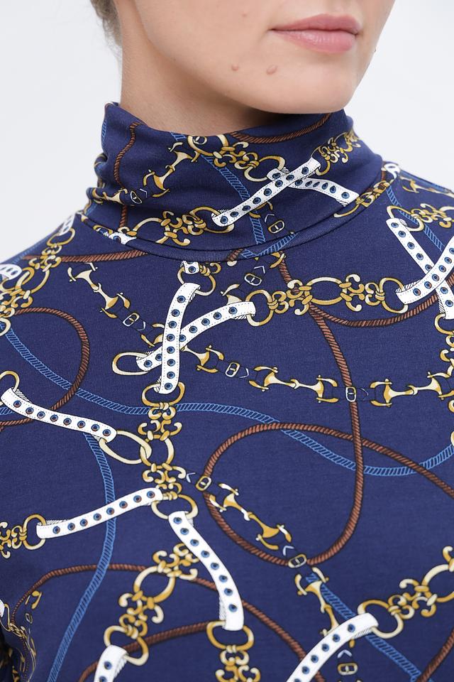 Водолазка имеет приталенный силуэт и короткий рукав, что делает ее универсальной для различных случаев. Главной особенностью модели является яркий принт в виде цепочек на синем фоне, который добавляет образу изысканности и индивидуальности.