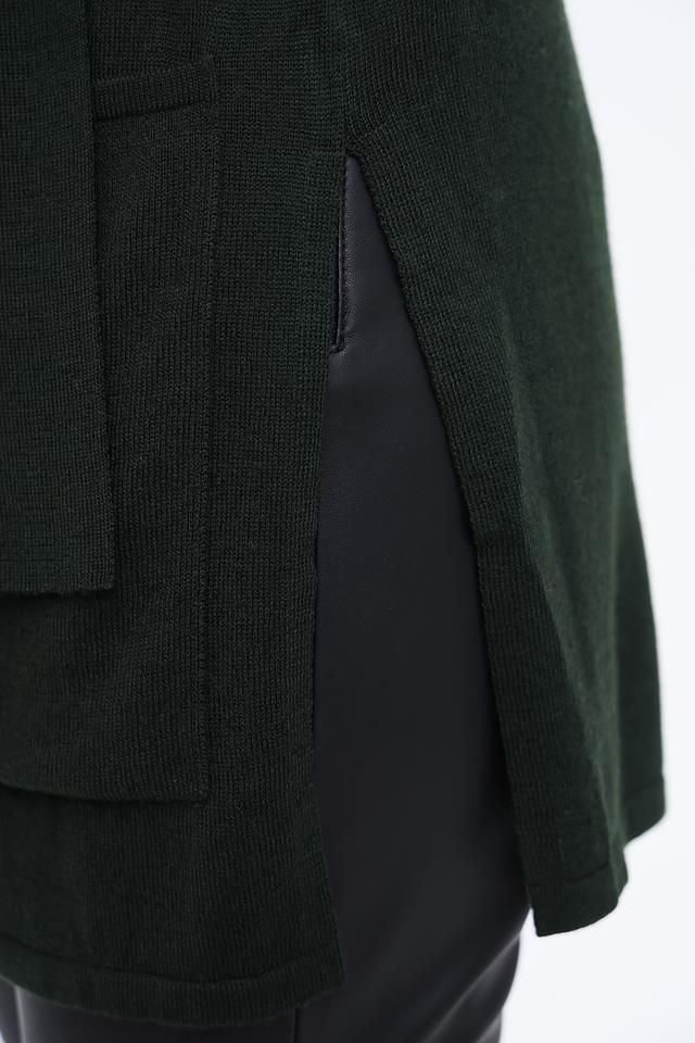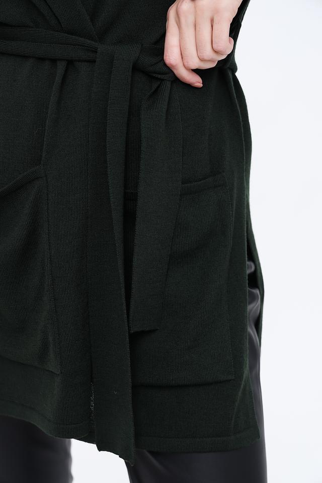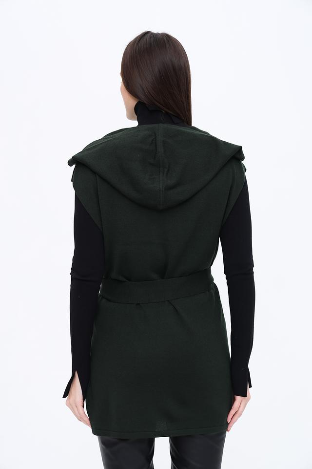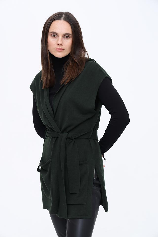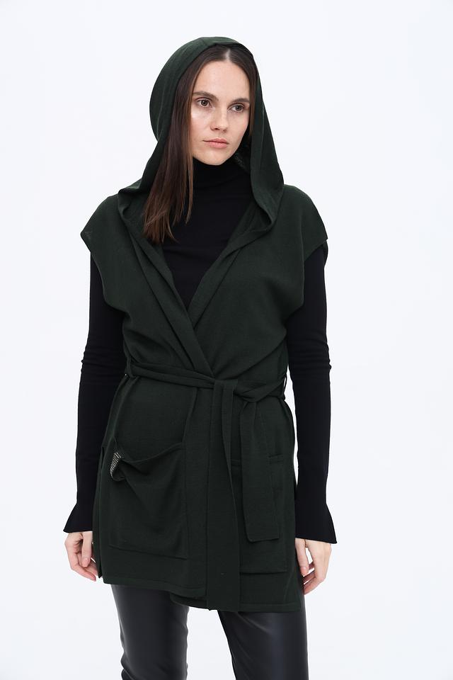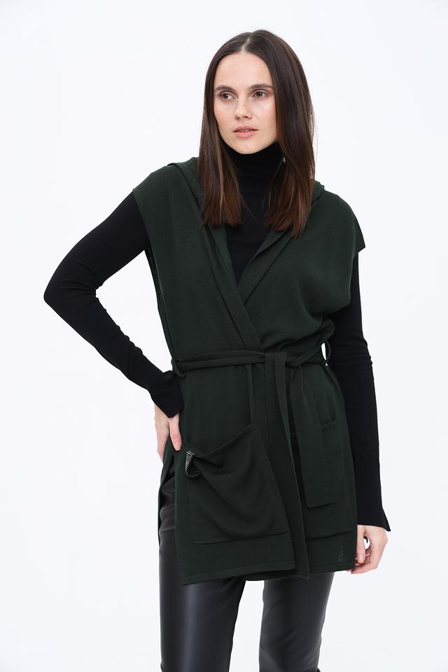 Тёмно-зелёный жилет Pezzo с капюшоном и поясом – стильное и комфортное решение для создания многослойных образов. Изготовлен из мягкого трикотажа с добавлением шерсти, что обеспечивает тепло и уют. Состав: шерсть 50%, акрил 50%