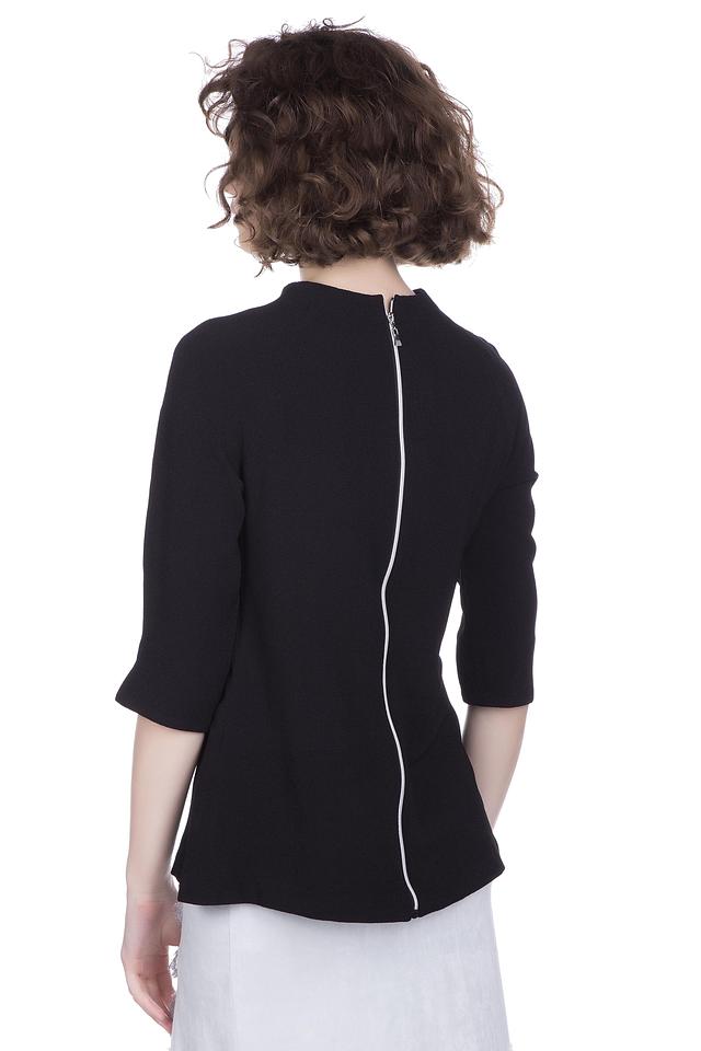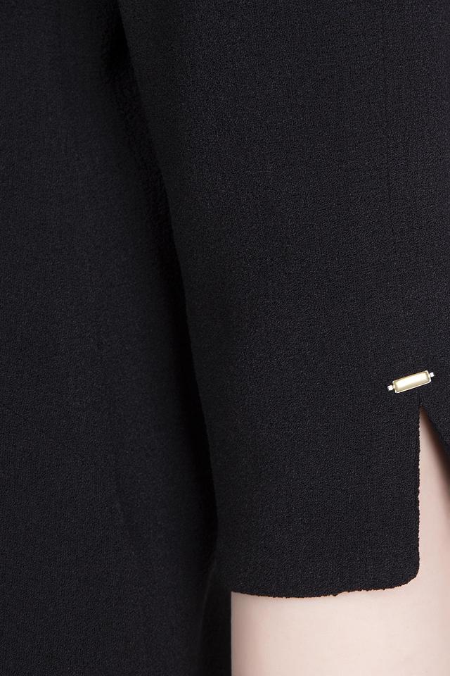 Блуза имеет прямой крой, который обеспечивает комфортную посадку по фигуре. Короткий рукав 3/4 с небольшим разрезом добавляет образу лёгкости и оригинальности. Застёжка на молнию в верхней части спины обеспечивает удобство надевания и снятия.