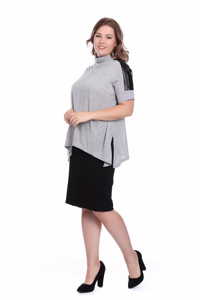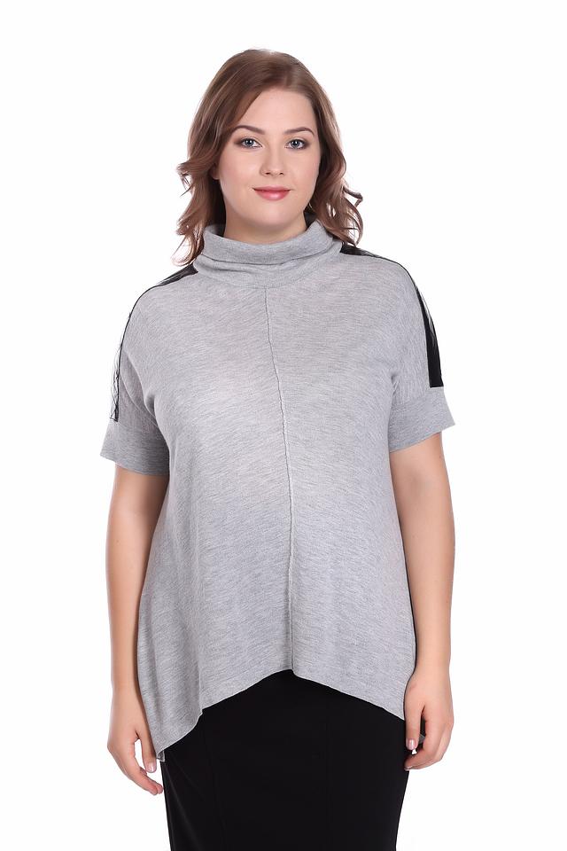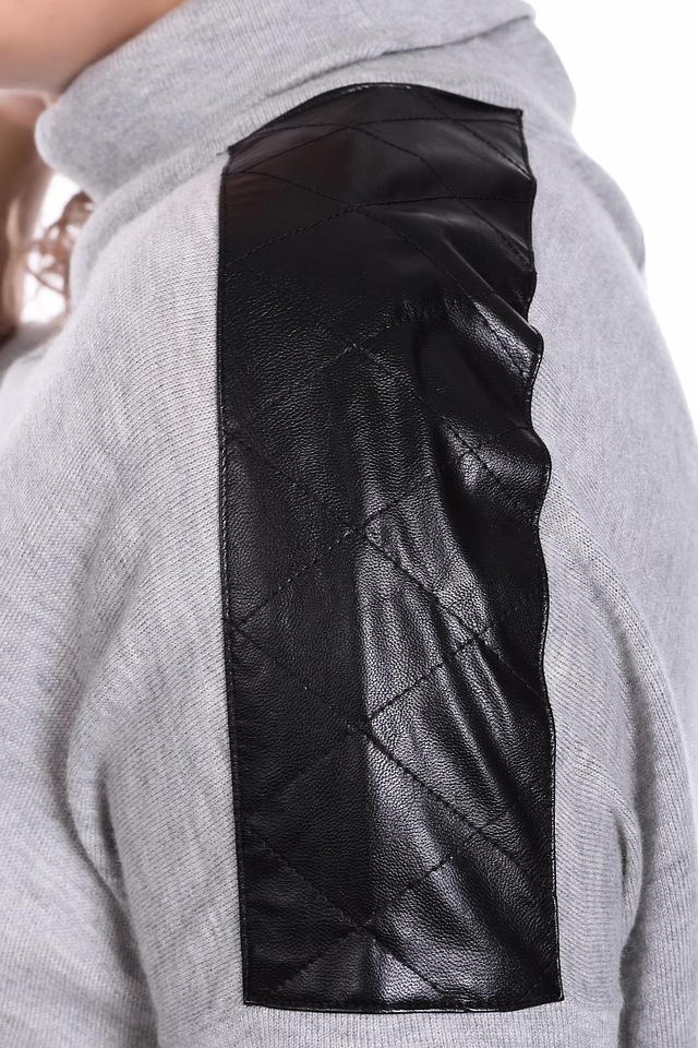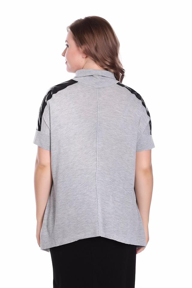Пуловер имеет серый цвет и короткие рукава, украшенные черными вставками из экокожи. Высокий воротник добавляет элегантности, а асимметричный низ придает образу динамичность и оригинальность.