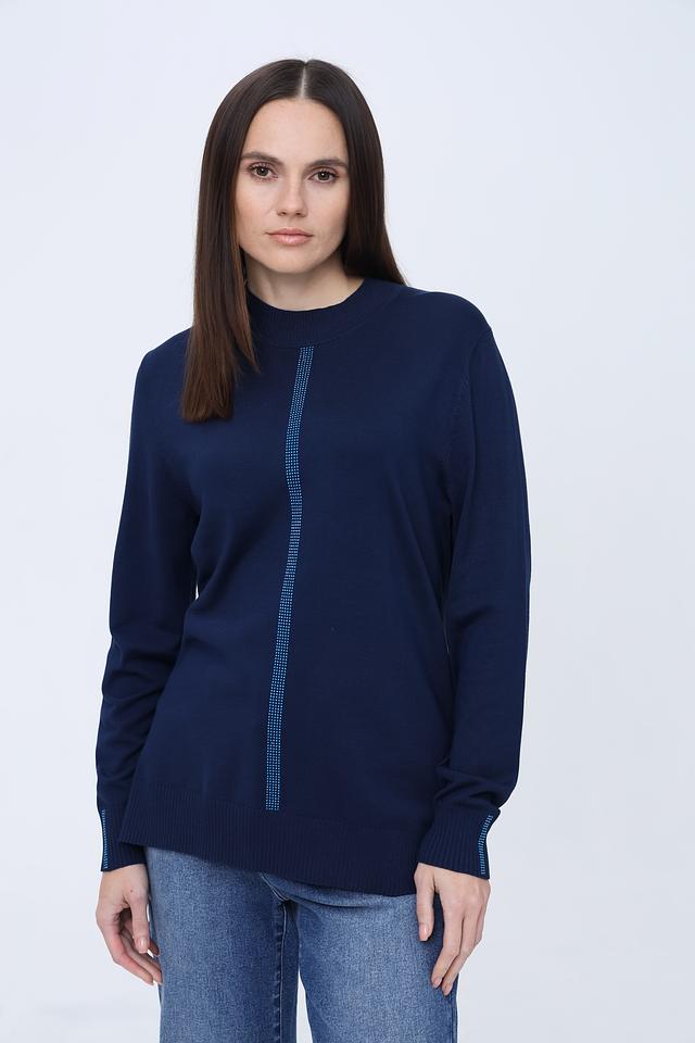 Синий пуловер Pezzo с вертикальной декоративной полосой из страз – стильное и комфортное решение для повседневного образа. Изготовлен из мягкой вискозы с добавлением нейлона, что обеспечивает приятные тактильные ощущения и хорошую посадку. Состав: вискоза 80%, нейлон 20%