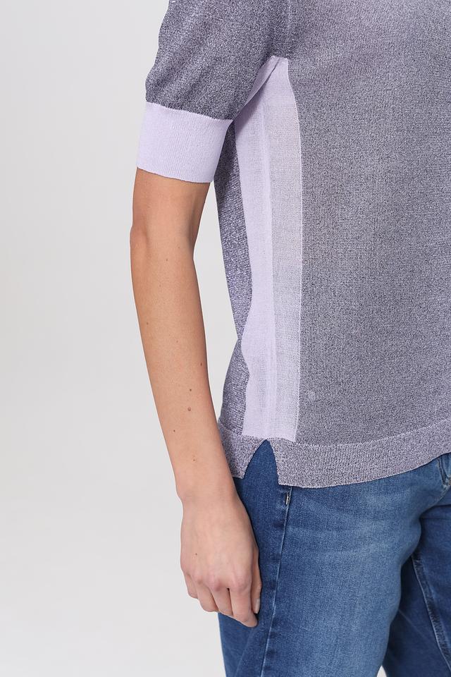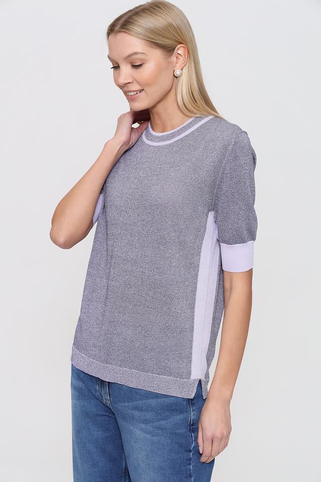 Женский пуловер Pezzo серого цвета с коротким рукавом и лавандовой отделкой горловины и рукавов. Модель выполнена из мягкого трикотажа с добавлением вискозы и имеет слегка свободный крой. Состав: вискоза 76%, нейлон 10%, полиэстер 9%, металл 5%