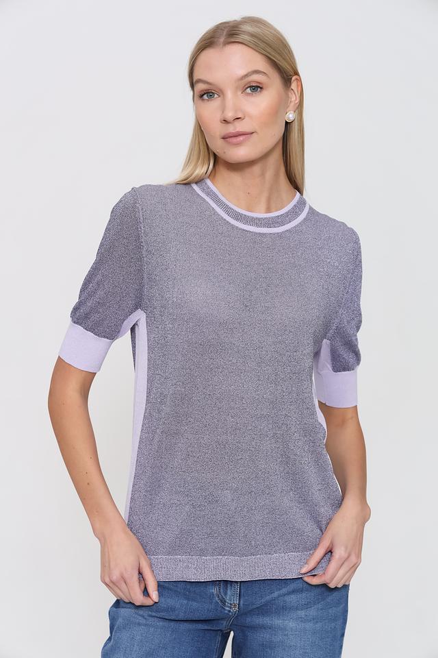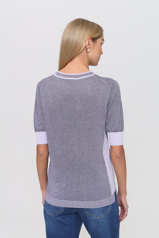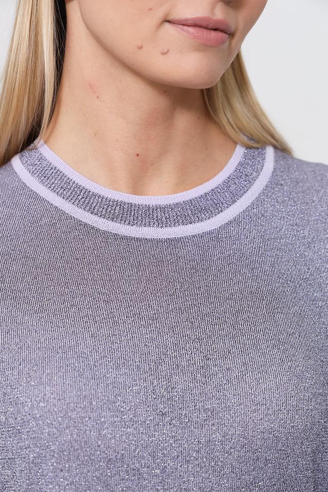 Пуловер имеет серый цвет с легким мерцающим эффектом, который придает ему изысканность. Горловина и манжеты рукавов оформлены лавандовой полосой, создавая контрастный и привлекательный акцент.