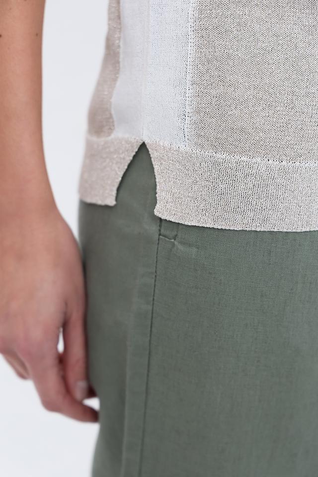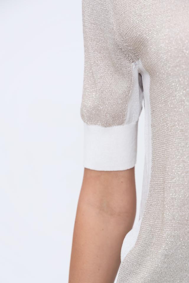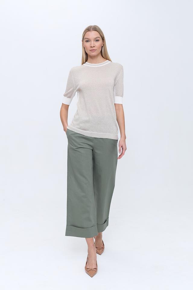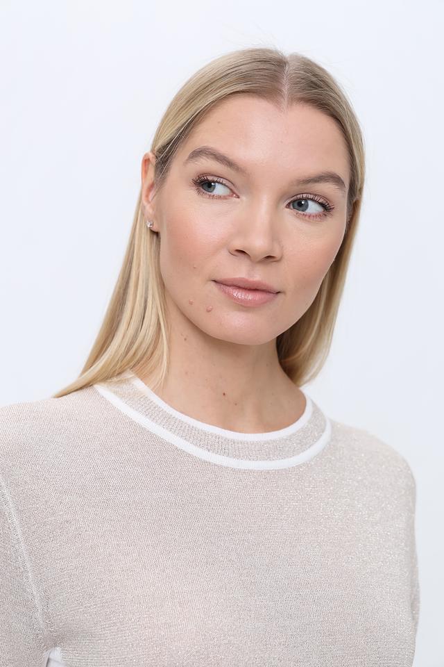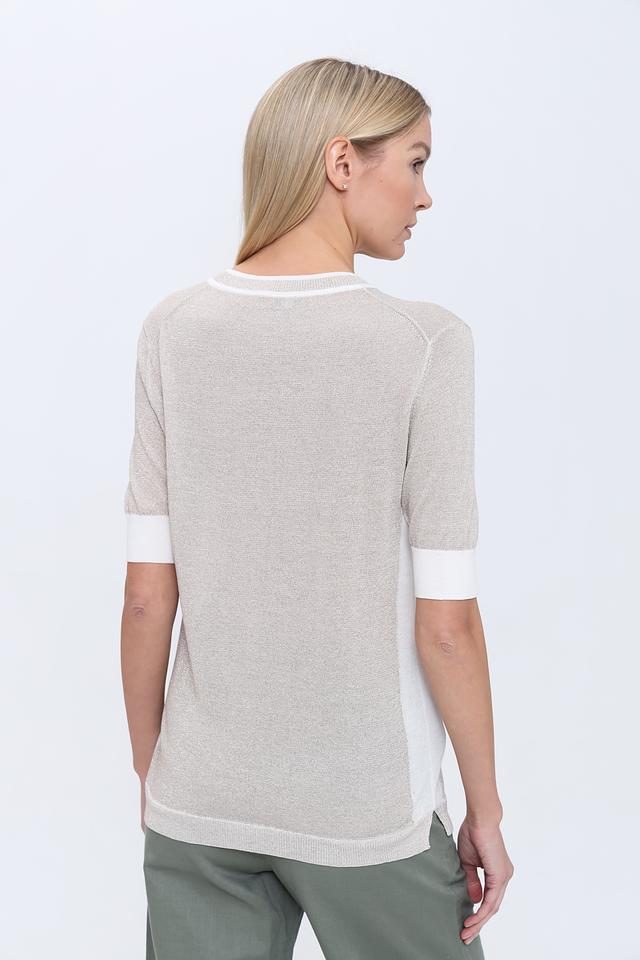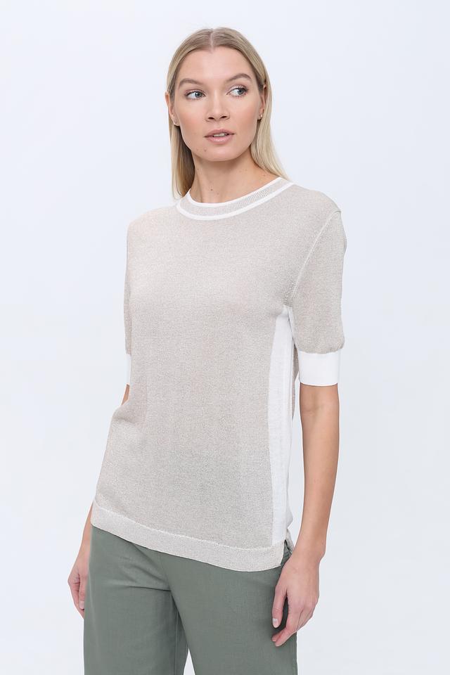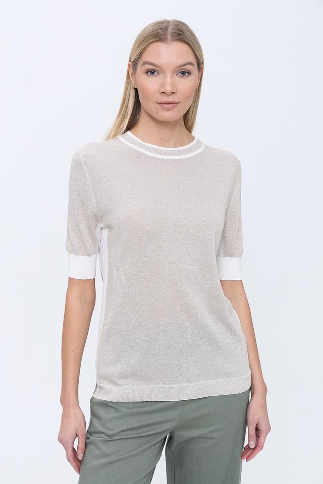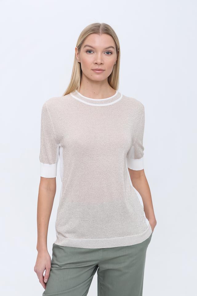 Бежевый пуловер Pezzo с коротким рукавом и белой отделкой на горловине и рукавах. Изготовлен из мягкой вискозы с добавлением нейлона и полиэстера для комфорта и износостойкости. Состав: вискоза 76%, нейлон 10%, полиэстер 9%, металл 5%