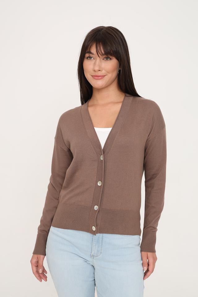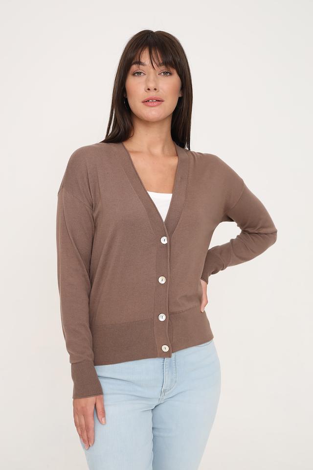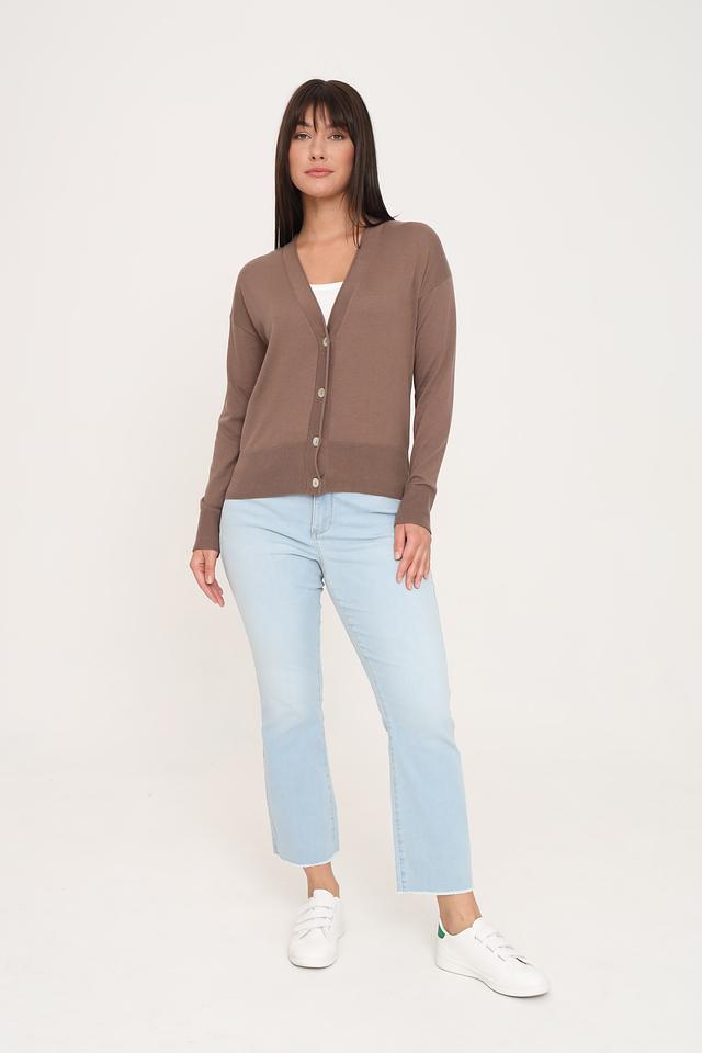 Этот кардиган от Pezzo выполнен в спокойном коричневом цвете и станет отличным дополнением к вашему гардеробу. Модель имеет V-образный вырез и застёжку на пуговицы, что позволяет создавать различные образы.
