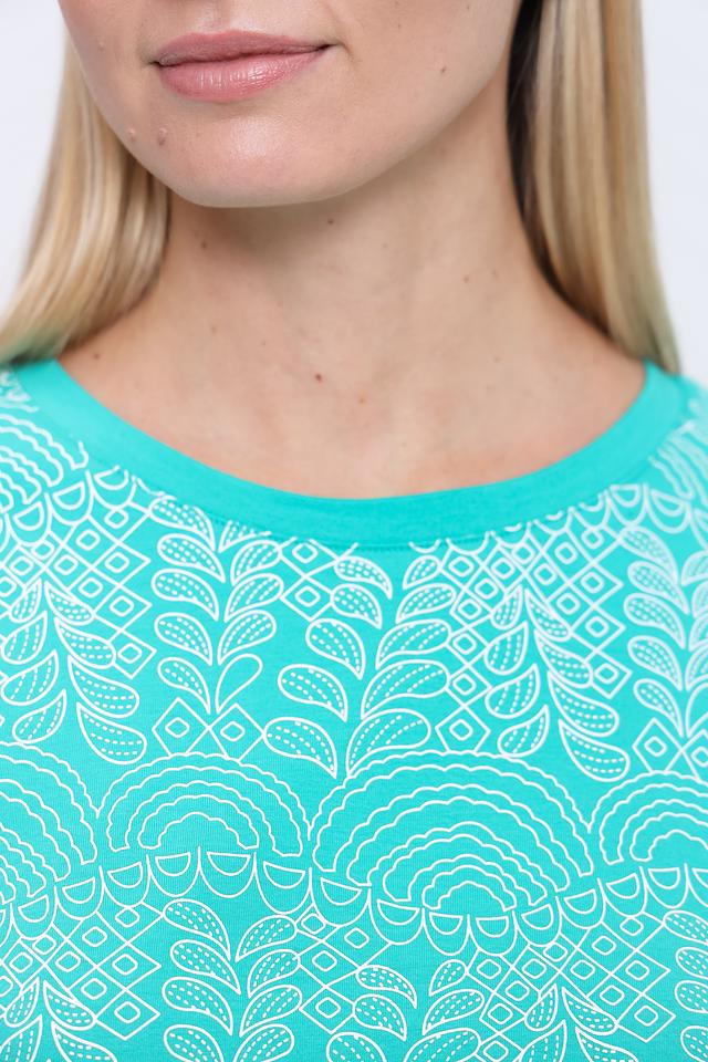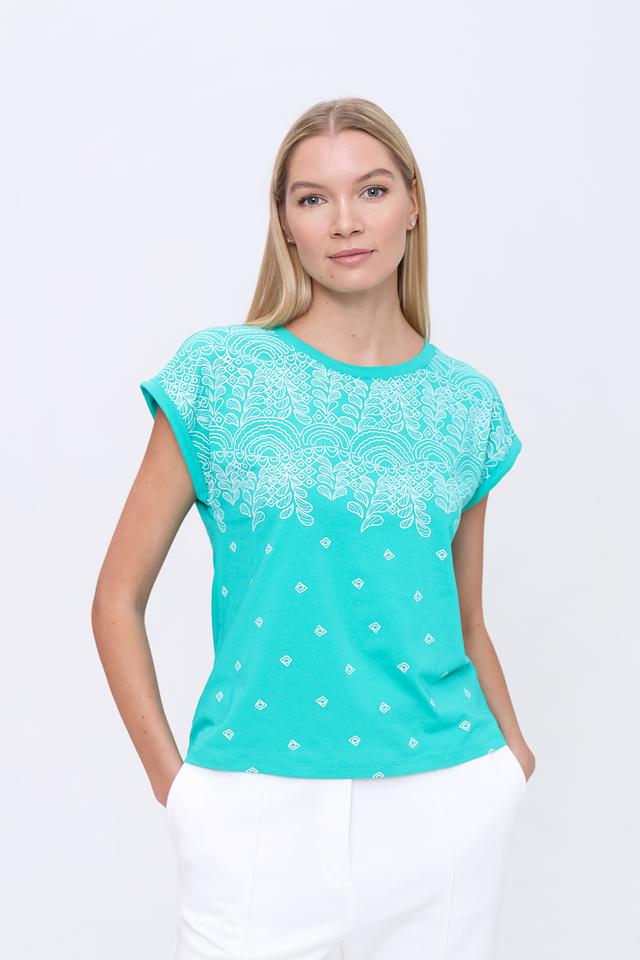 Эта футболка от Pezzo выполнена в приятном бирюзовом цвете и украшена изысканной вышивкой на плечах. Вышивка выполнена в белых тонах и создает эффектный контраст с основным цветом изделия.