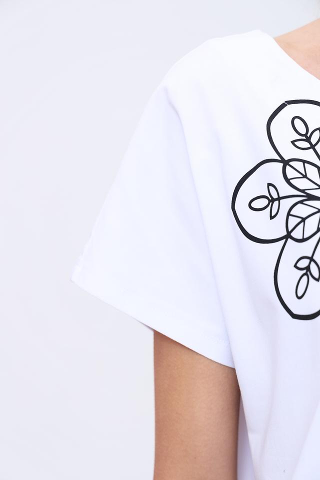 Основной цвет футболки – белый, что делает её универсальной и легко сочетаемой с другими элементами одежды. Главная особенность модели – эффектный чёрно-белый принт, изображающий сложный цветочный орнамент. Этот рисунок добавляет образу оригинальности и выразительности.