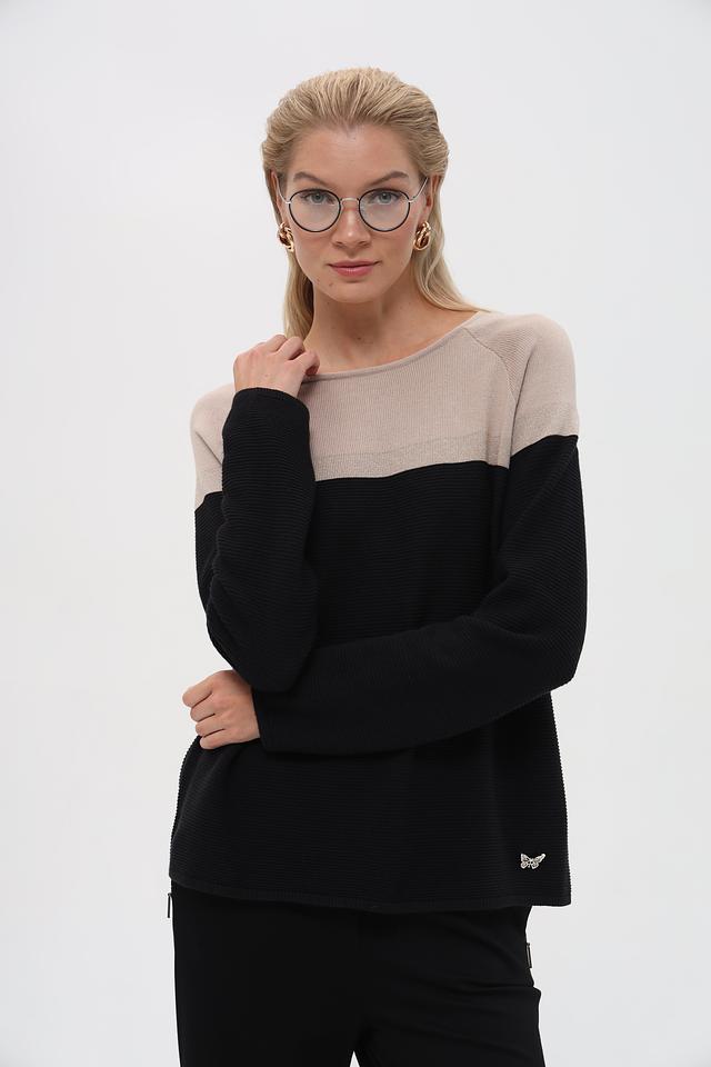 Женский пуловер Pezzo чёрно-бежевого цвета – стильная модель с комбинированным дизайном. Изготовлен из мягкого хлопка с добавлением акрила, обеспечивающего комфорт и износостойкость. Идеально сочетается с различными элементами гардероба. Состав: хлопок 60%, акрил 40%