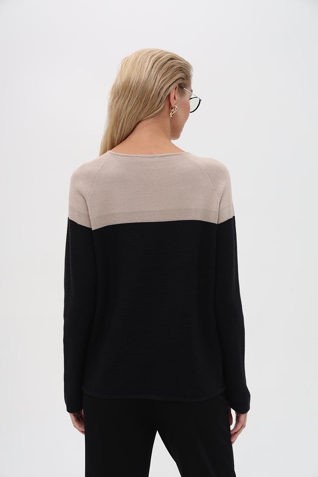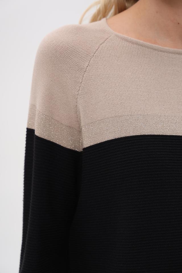 Верхняя часть пуловера выполнена из гладкого бежевого трикотажа, а нижняя – из текстурированного чёрного вязаного полотна. Такое сочетание фактур делает этот пуловер особенно интересным и привлекательным. Небольшой логотип бренда расположен на груди.