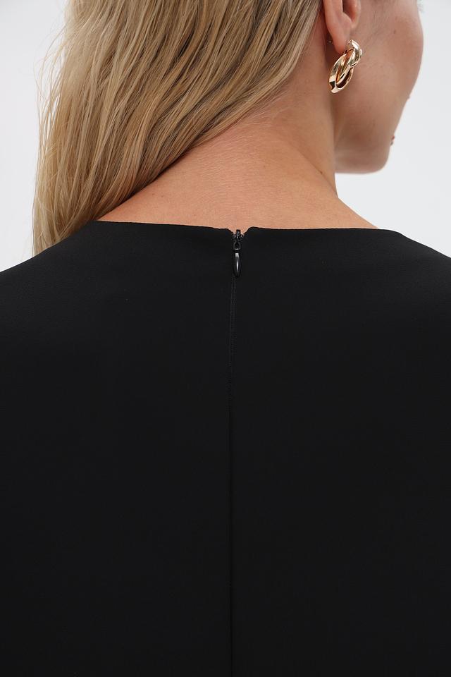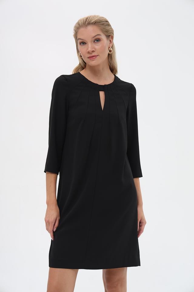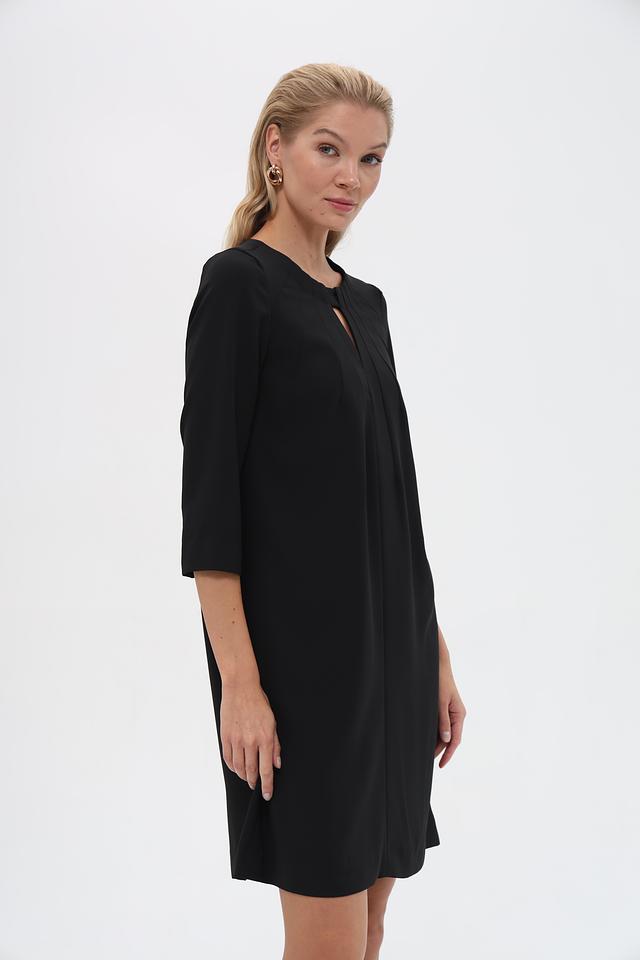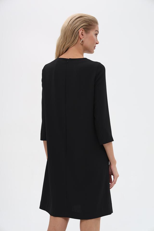 Платье имеет классический чёрный цвет, который легко сочетается с различными аксессуарами и обувью. Это универсальный предмет гардероба, который будет уместен в любой ситуации. Застёжка – потайная молния в боковом шве.